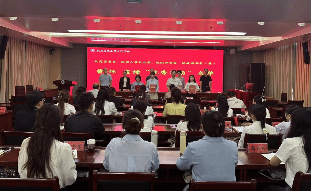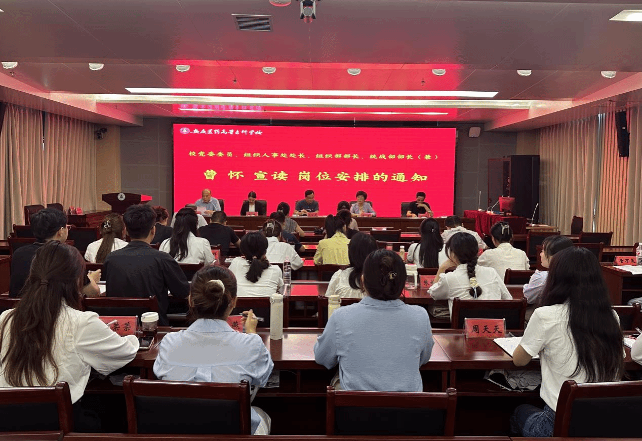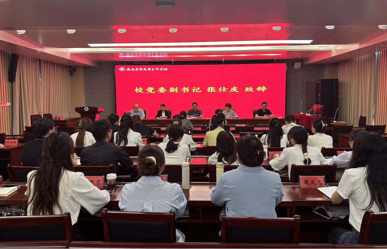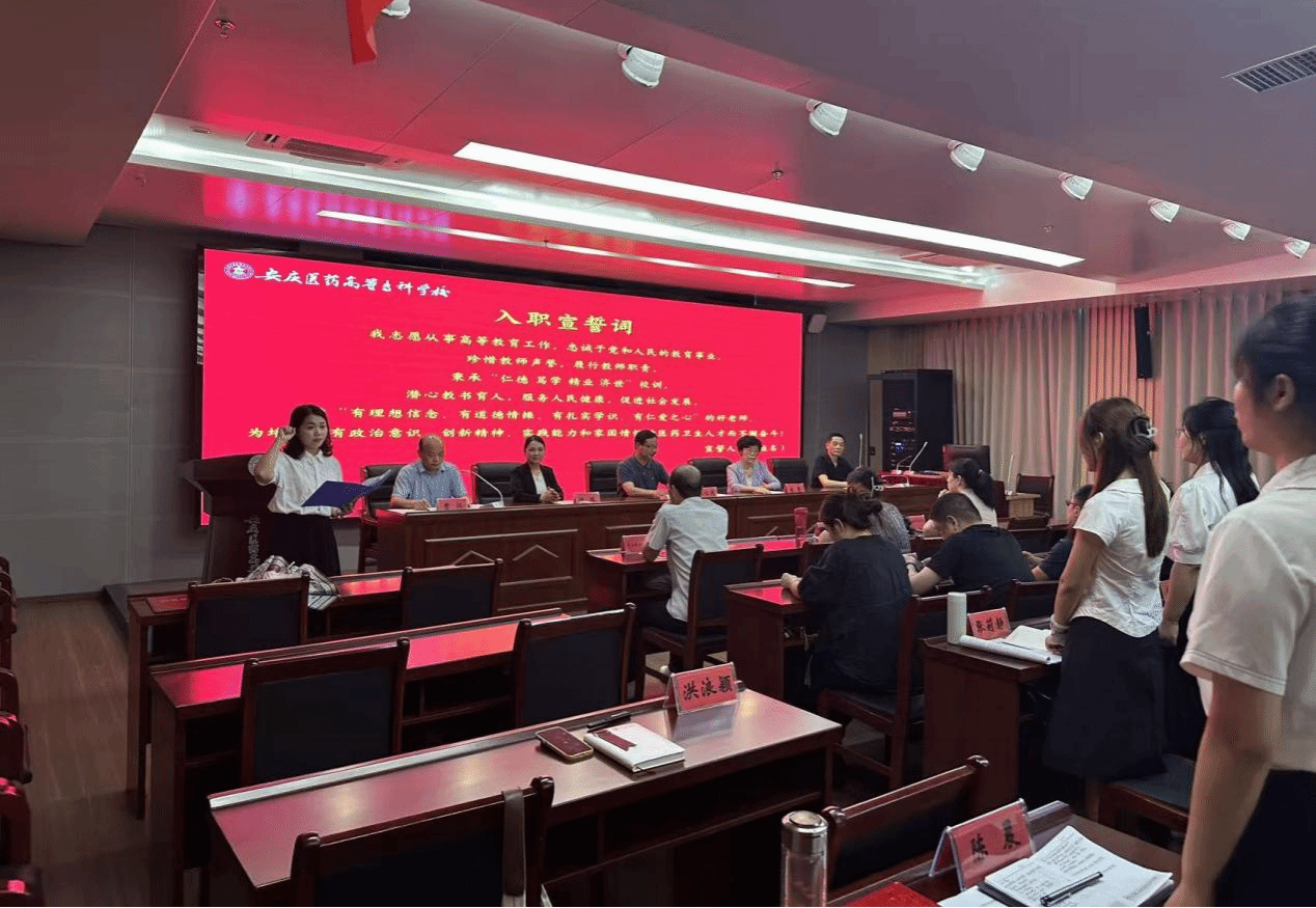 2025年8月28日下午,安庆医药高等专科学校在双创中心第一会议室举行2025年招录人员适岗培训结业式暨入职宣誓仪式。校党委副书记张仕庆、校党委委员朱雯、陈琪、刘毅、教务处、学生处、科技处、相关学院负责同志及2025年新入职教师参会。会议由校党委委员曹怀主持。