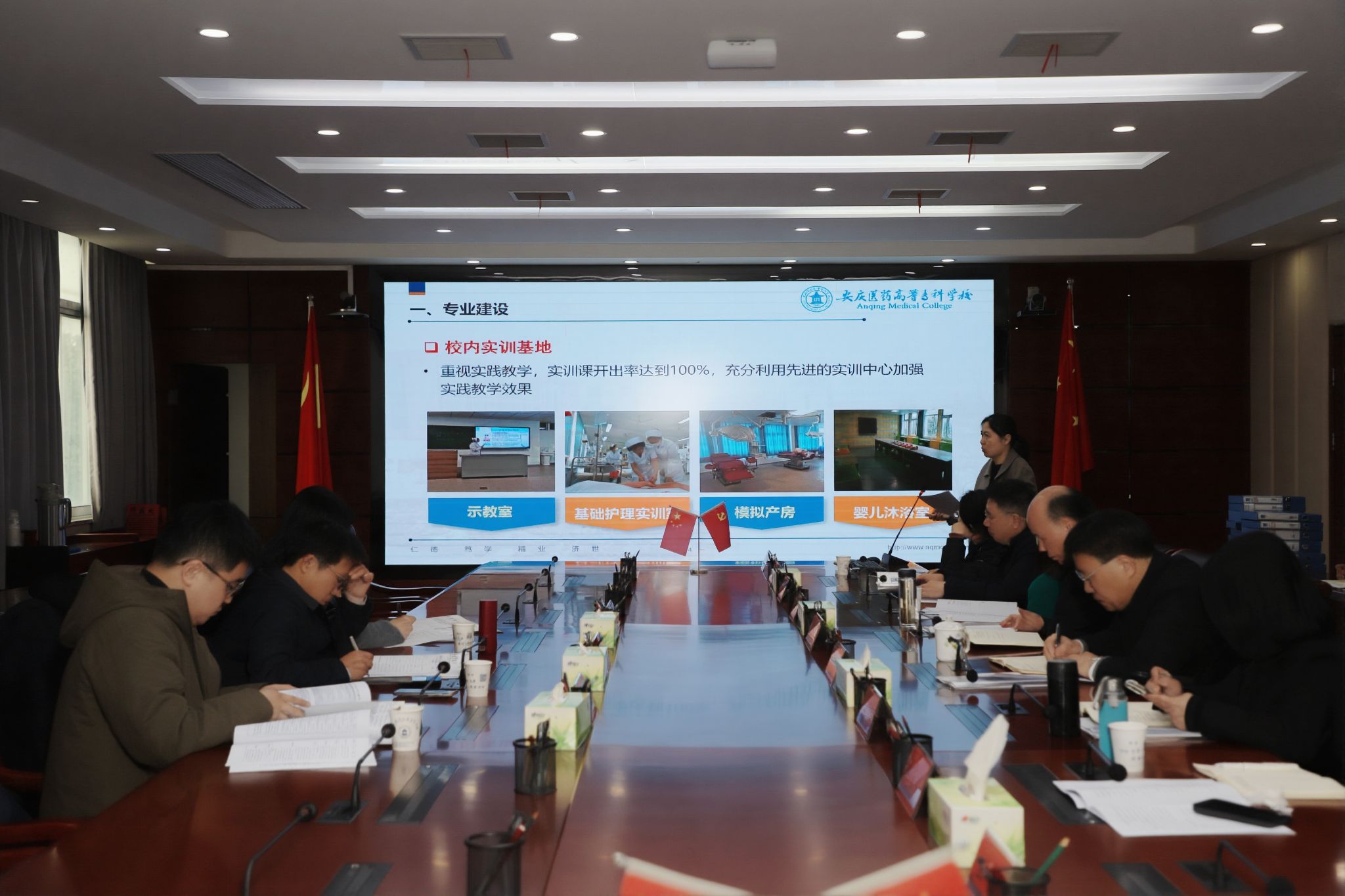 近日安徽省高等职业院校第三批双师型教师培训基地候选单位实地考察工作在学校顺利开展。安徽省教育厅专家组组长、省高校师资培训中心常务副主任台启权一行三人莅临,学校申报的健康管理促进“双师型”教师培训基地开展实地考察工作。考察会议在学校行政楼三楼大会议室召开,校党委副书记、校长朱庆丰主持会议并作专题汇报校党委委员陈琪、曹怀,学校相关职能部门及联合申报合作企业有关负责人陪同考察。