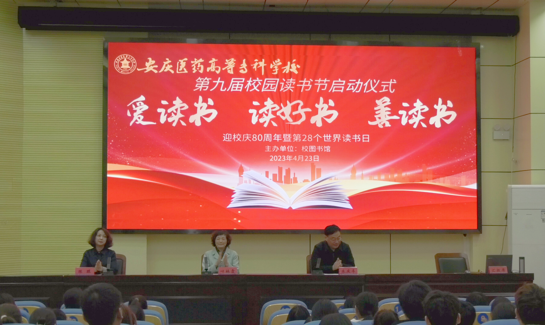 垂柳拂绿水,摇艳东风年。为贯彻落实党的二十大报告中“深化全民阅读活动”的要求,充分发挥校图书馆在书香校园建设中的作用,在喜迎第28个“世界读书日”及校庆八十周年之际,2023年4月23日中午,校图书馆在学术报告厅隆重举办第九届校园读书节启动仪式,党委书记叶林霞,党委委员、副校长朱庆丰,党委委员陈琪,相关职能部门及各学院的师生代表、获奖师生、读者协会会员共170余人参加了活动,启动仪式由图书馆负责人高旭主持。