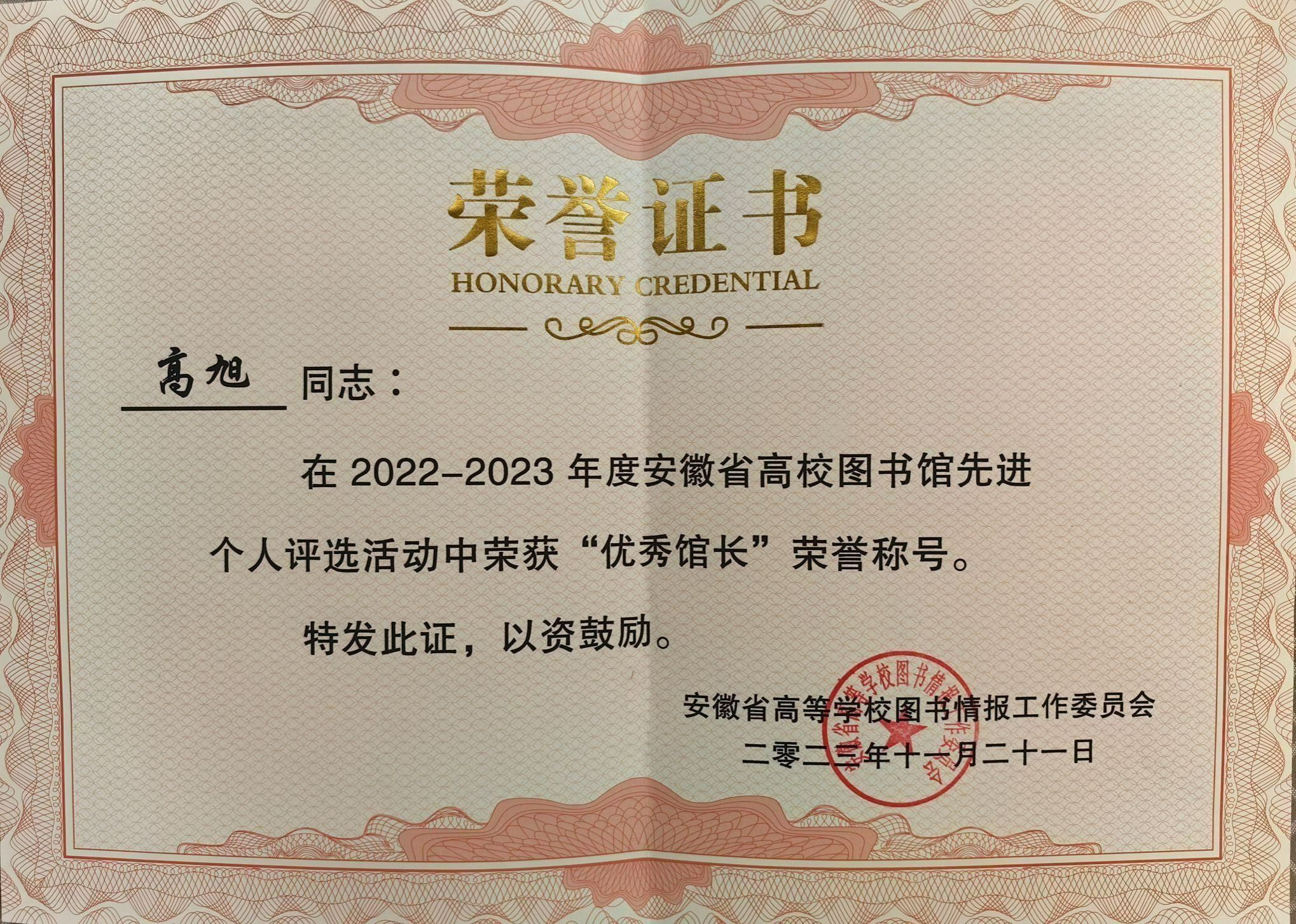 11月30日—12月2日,“安徽省高校图工委成立40周年纪念会暨2023年安徽省高校图书馆馆长年会”在黄山学院召开,全省71所高校参加。我校图书馆馆长高旭荣获“安徽省高校图书馆2022-2023年度优秀馆长”称号。