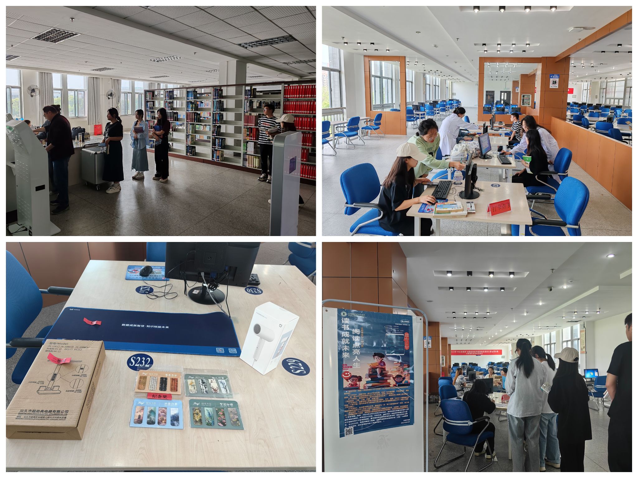 本次活动的主题为“读书成就未来,阅读点亮人生”,共设有“问卷答题”、“图书借阅”、“资源下载”、“关注报名”、“欢乐抽奖”五项内容。活动现场人头攒动,读者纷纷到各打卡区打卡“盖章”:在“问卷答题”区参与问卷调查,通过答题深入了解图书馆布局、设施及第十届校园读书节的系列活动;在“图书借阅”区听馆员详细讲解图书馆自助借还设备及opac查询机的使用方法,并完成借阅4本纸质图书的打卡任务;在“资源下载”区,通过上机操作,沉浸式学习数据库访问、检索和下载文献的方法;在“关注报名”区关注校图书馆新建的微信公众号,并报名参加一项“第十届校园读书节”阅读推广活动;在“欢乐抽奖”区参与抽奖活动。