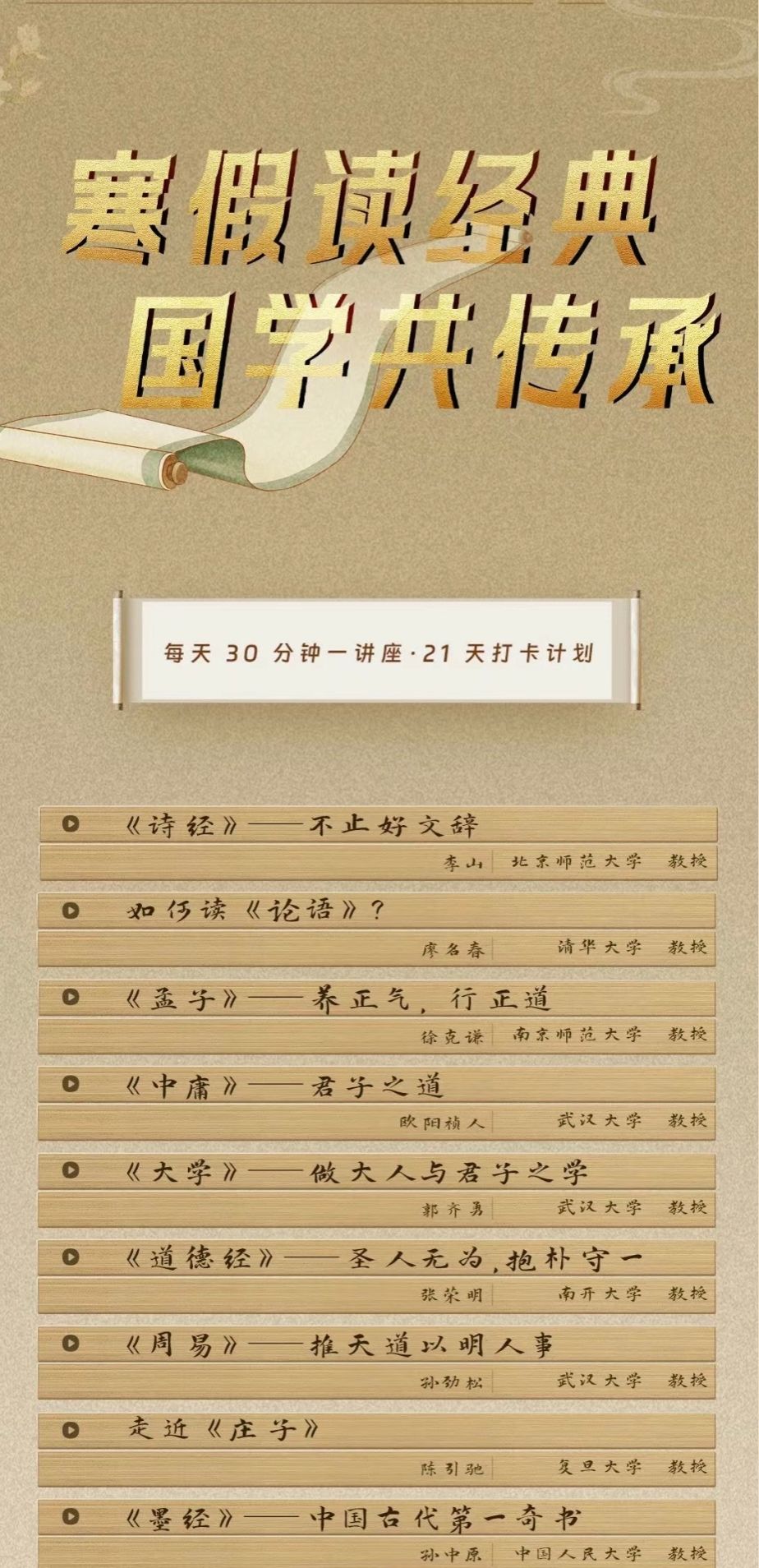 本次活动以“每天30分钟一讲座,21天持续打卡”的创新形式展开,旨在引导并鼓励学生们充分利用寒假时光,通过观看国学经典讲座视频,深入领略和传承中华优秀传统文化的精髓,进而提升自身的文化素养。为此,校图书馆精心挑选了《论语》、《孟子》、《大学》、《中庸》等国学经典著作的专家解读视频,每日推送给参与活动的学生,并设置了相应的打卡任务,激励学生们持之以恒地学习,同时分享自己的感悟和收获。