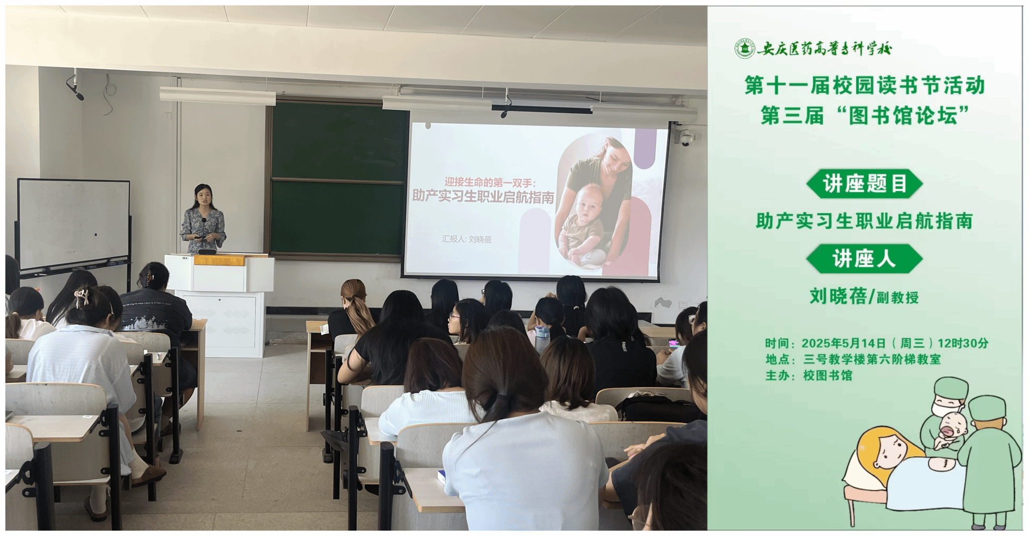 护理学院刘晓蓓副教授在第六阶梯教室举办了题为“助产实习生职业启航指南”的专题讲座,150余名助产专业学生到场聆听。