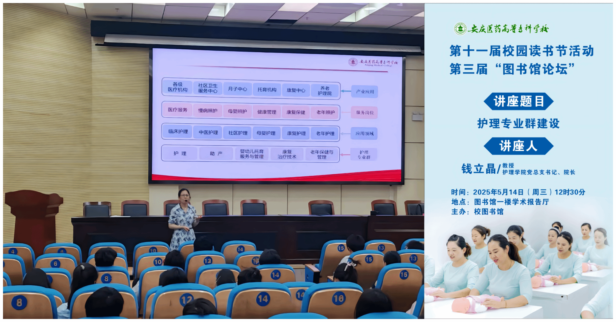 为助力职业教育适应产业升级,推动教育链与产业链深度融合,提升我校学生职业素养与技能水平,在2025年职业教育活动周期间,第三届“图书馆论坛”特邀护理学院两位老师于5月14日开展了两场职业教育专题讲座。
