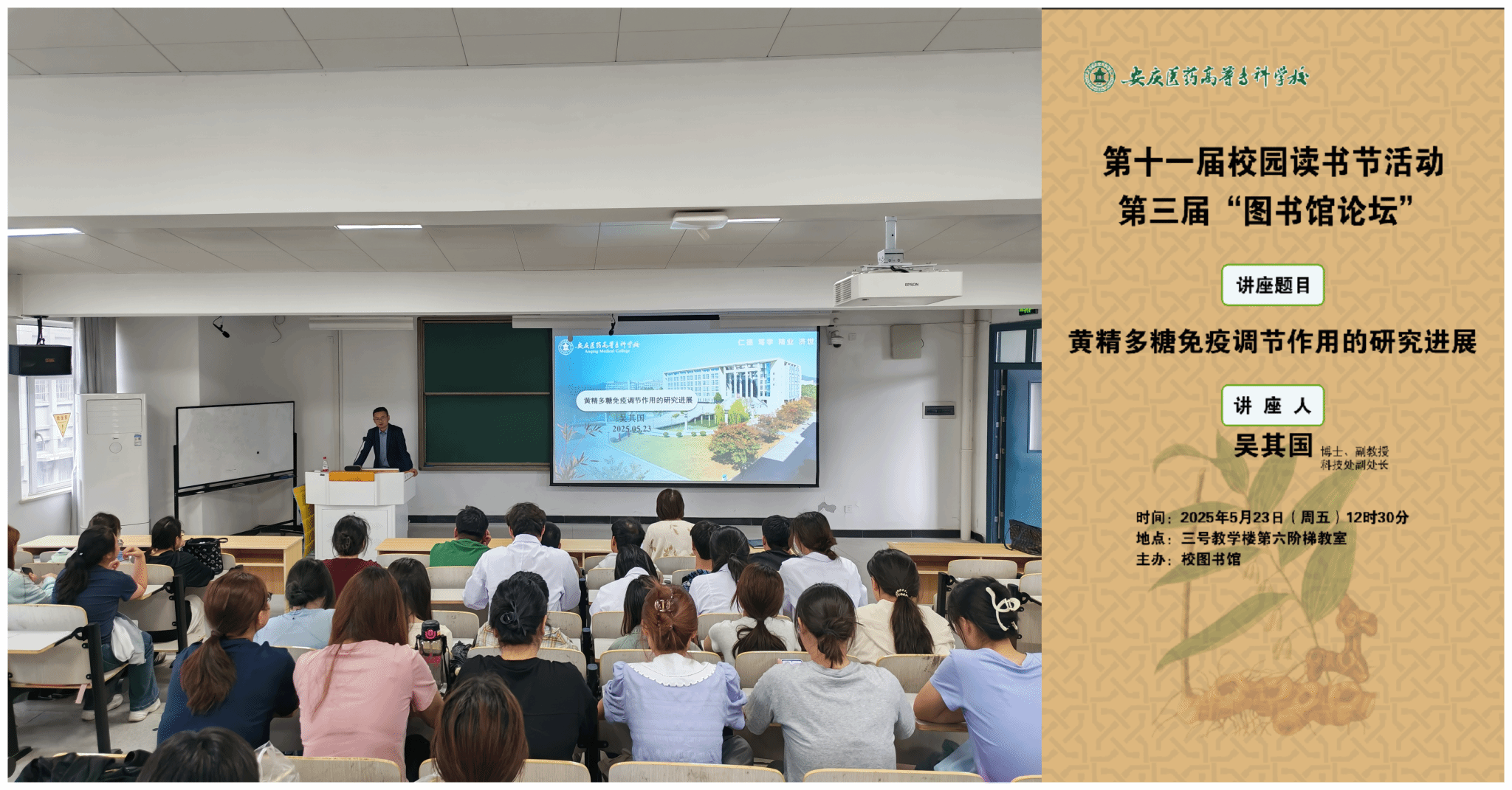 为拓宽师生学术视野,助力我校科研工作高质量发展。5月23日中午12时30分,校科技处副处长吴其国博士在第六阶梯教室举办了第三届“图书馆论坛”第十三场讲座:“黄精多糖免疫调节作用的研究进展”专题讲座,讲座深入探讨了黄精多糖的制备方法、免疫调节活性及其潜在应用价值,为师生带来了一场精彩的学术盛宴。