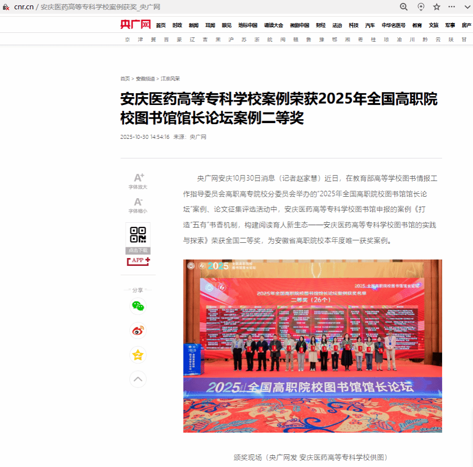 近日,在教育部高等学校图书情报工作指导委员会高职高专院校分委员会主办的“2025年全国高职院校图书馆馆长论坛”案例、论文征集评选活动中,我校图书馆申报的案例《打造“五有”书香机制,构建阅读育人新生态——安庆医药高等专科学校图书馆的实践与探索》荣获二等奖,系安徽省高职院校本年度唯一获奖案例。