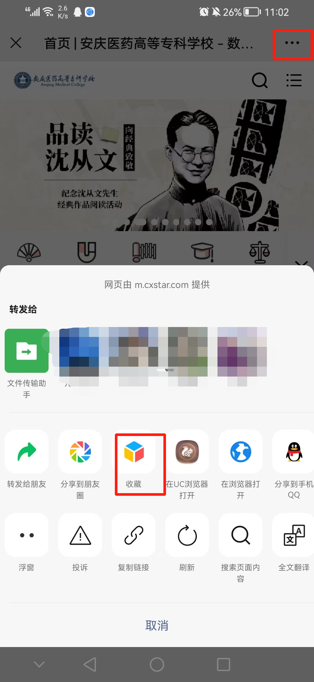 十八、点击首页右上角“三点”图标(如未自动返回首页,请再次使用“微信扫一扫”扫描第九步骤二维码),选择“收藏”