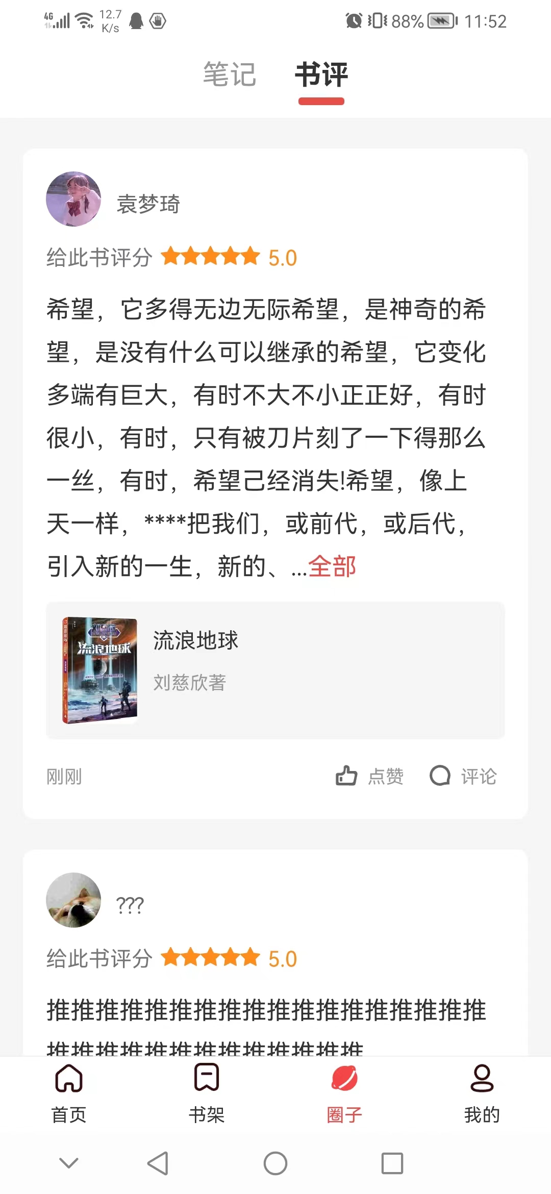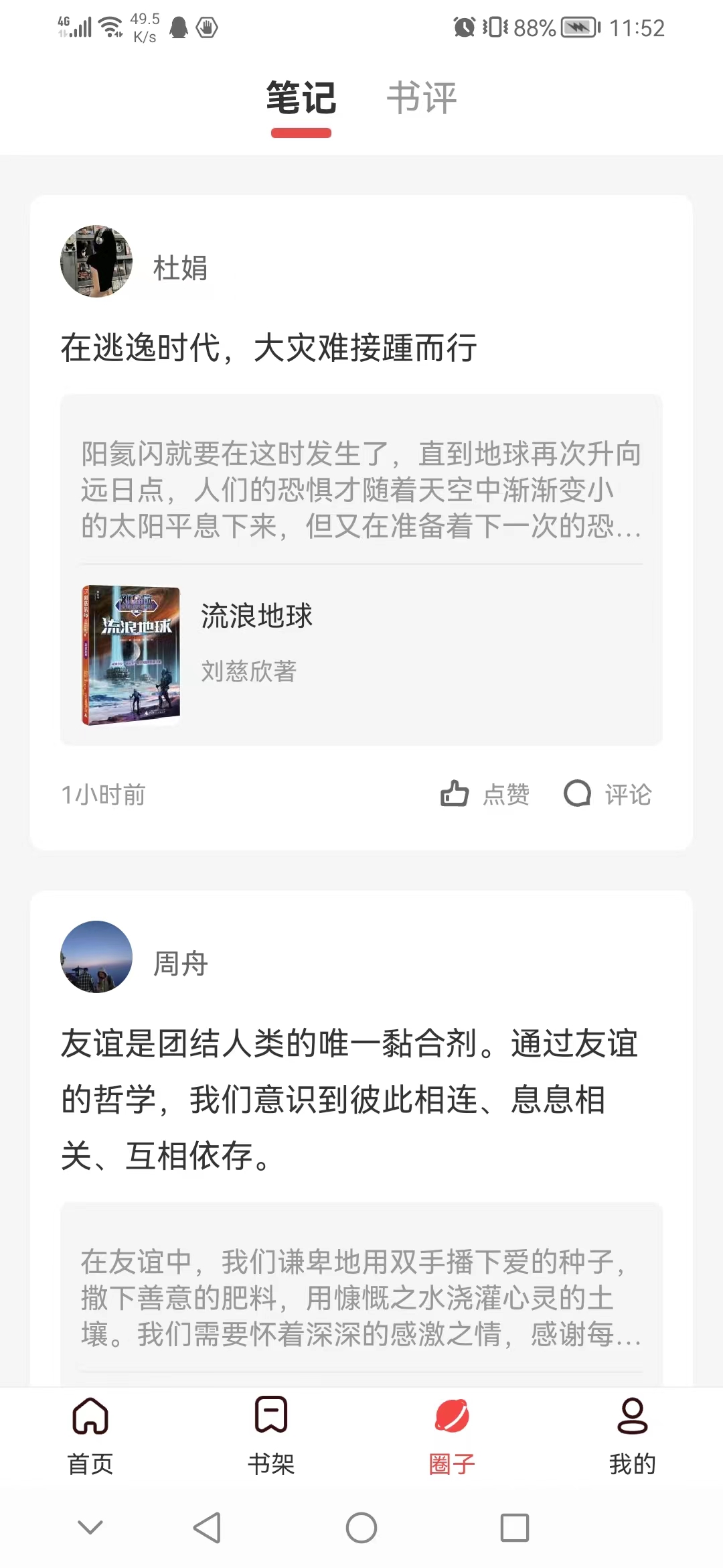 二十六、点击主页“圈子”按钮,我们会看到“笔记”和“书评”选项,这对我们阅读书籍、理解书籍有莫大的帮助,同时也是获取积分的好方法哦