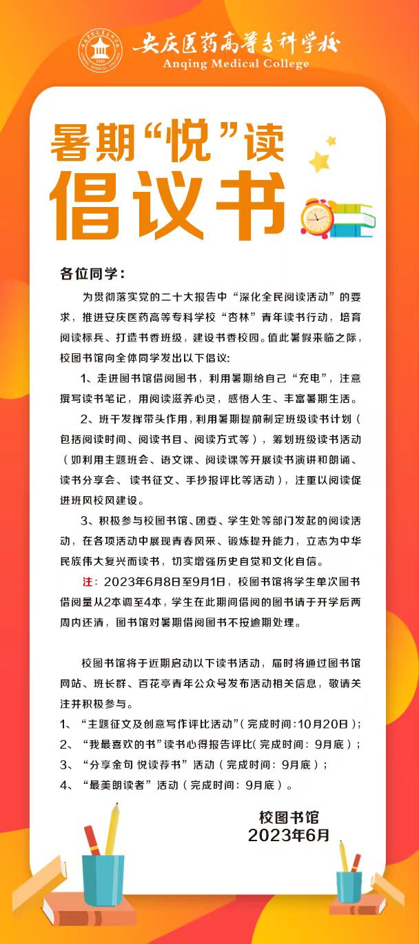 为贯彻落实党的二十大报告中“深化全民阅读活动”的要求,推进安庆医药高等专科学校“杏林”青年读书行动,培育阅读标兵、打造书香班级,建设书香校园。值此暑假来临之际,校图书馆向全体同学发出以下倡议: