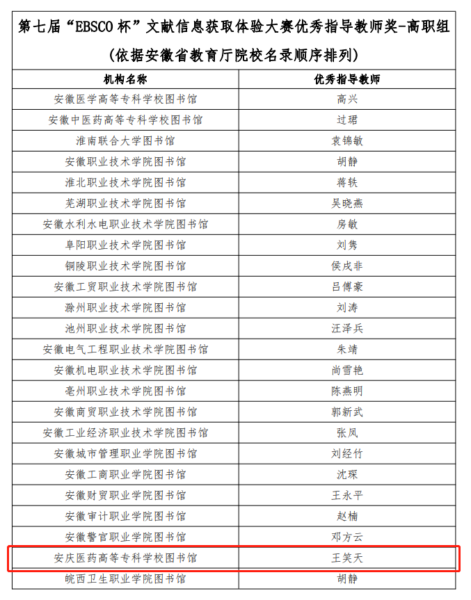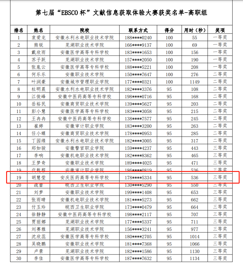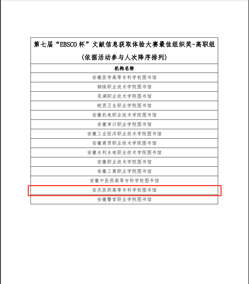 截止到2023年5月31日,“阅文·阅世界”第七届“EBSCO杯”文献信息获取体验大赛共计收到全省61212份答卷,依据榜单排名并经过重名复核,来自安徽省本科及高职院校共计119名读者分别获得一二三等奖。