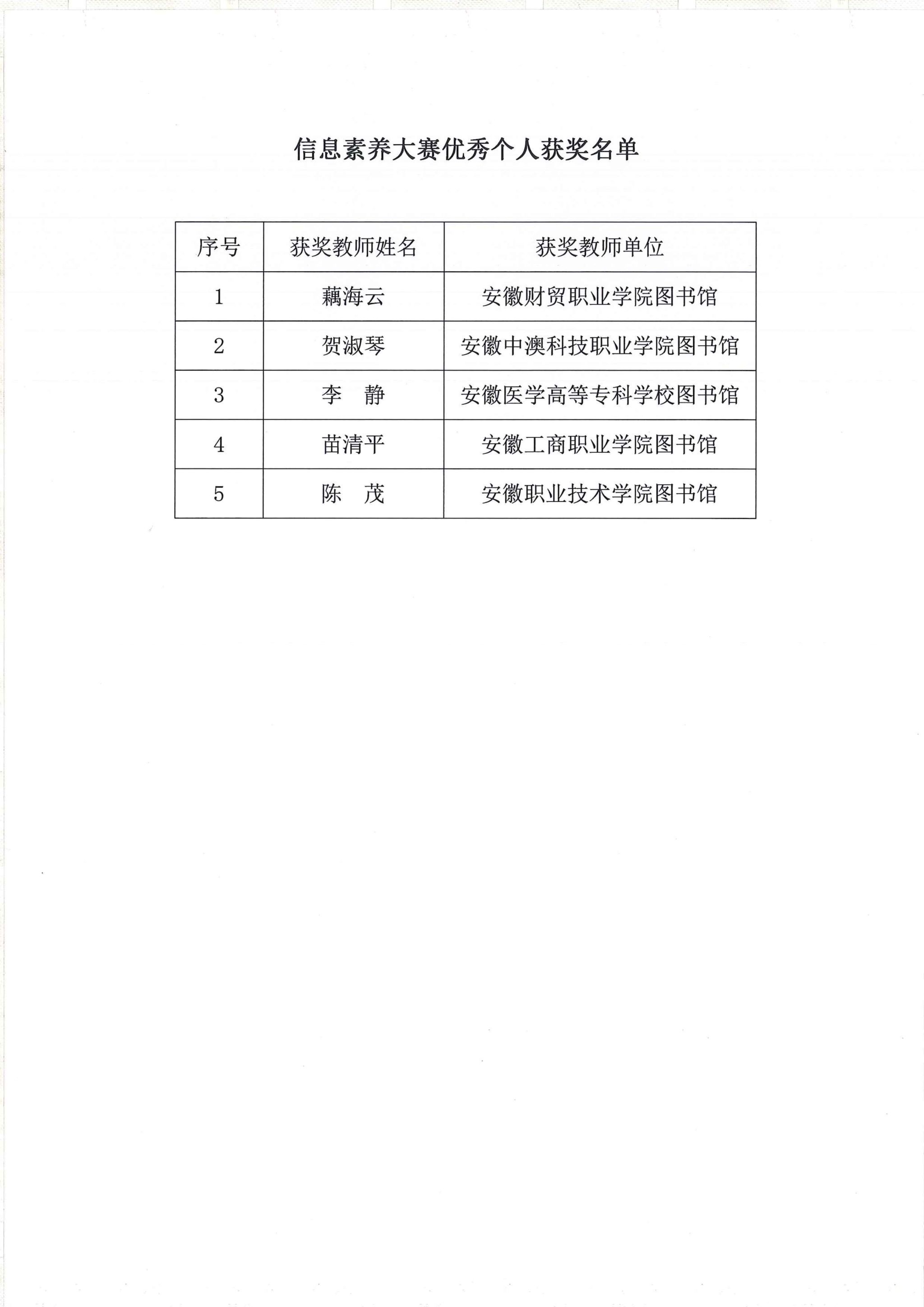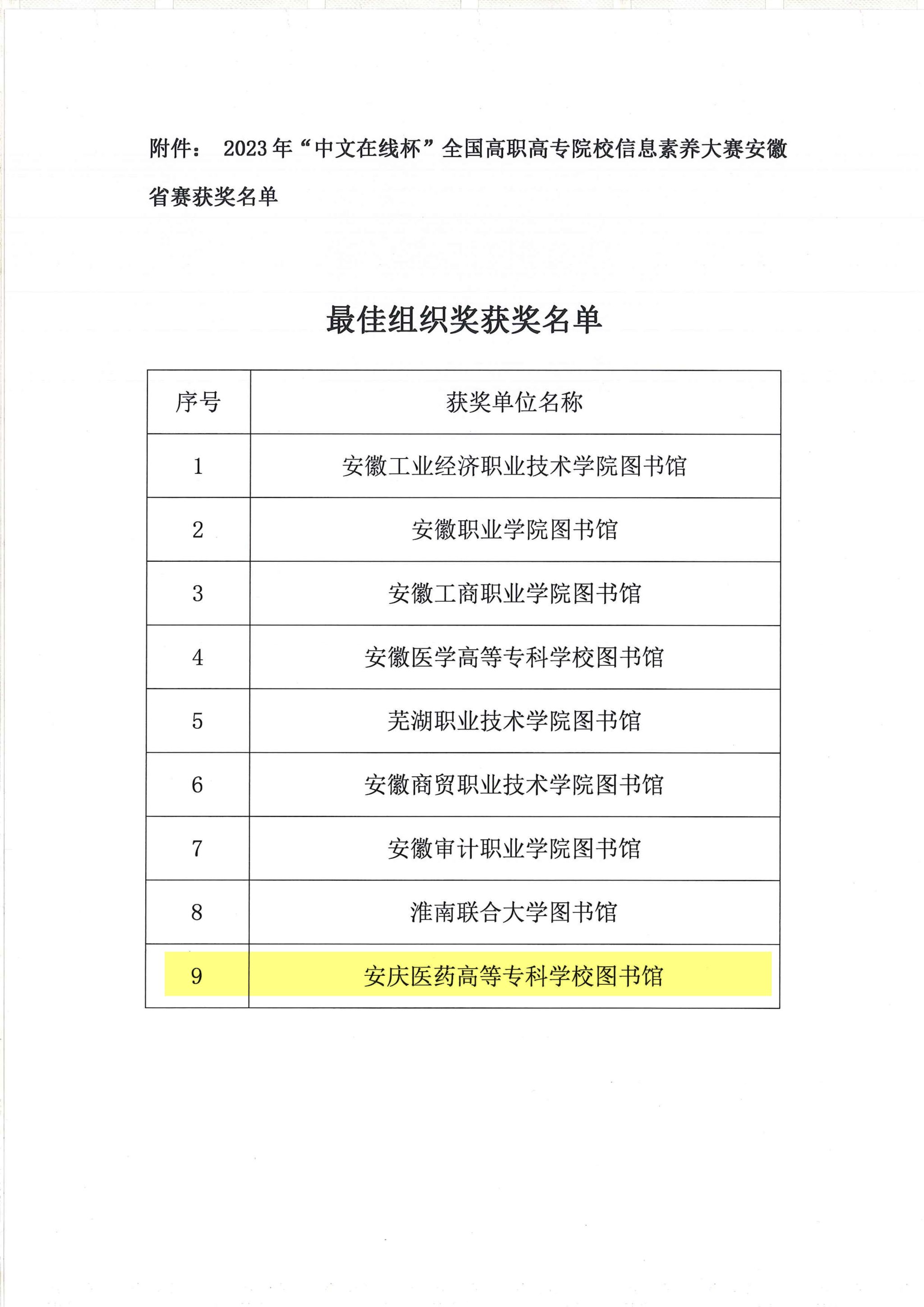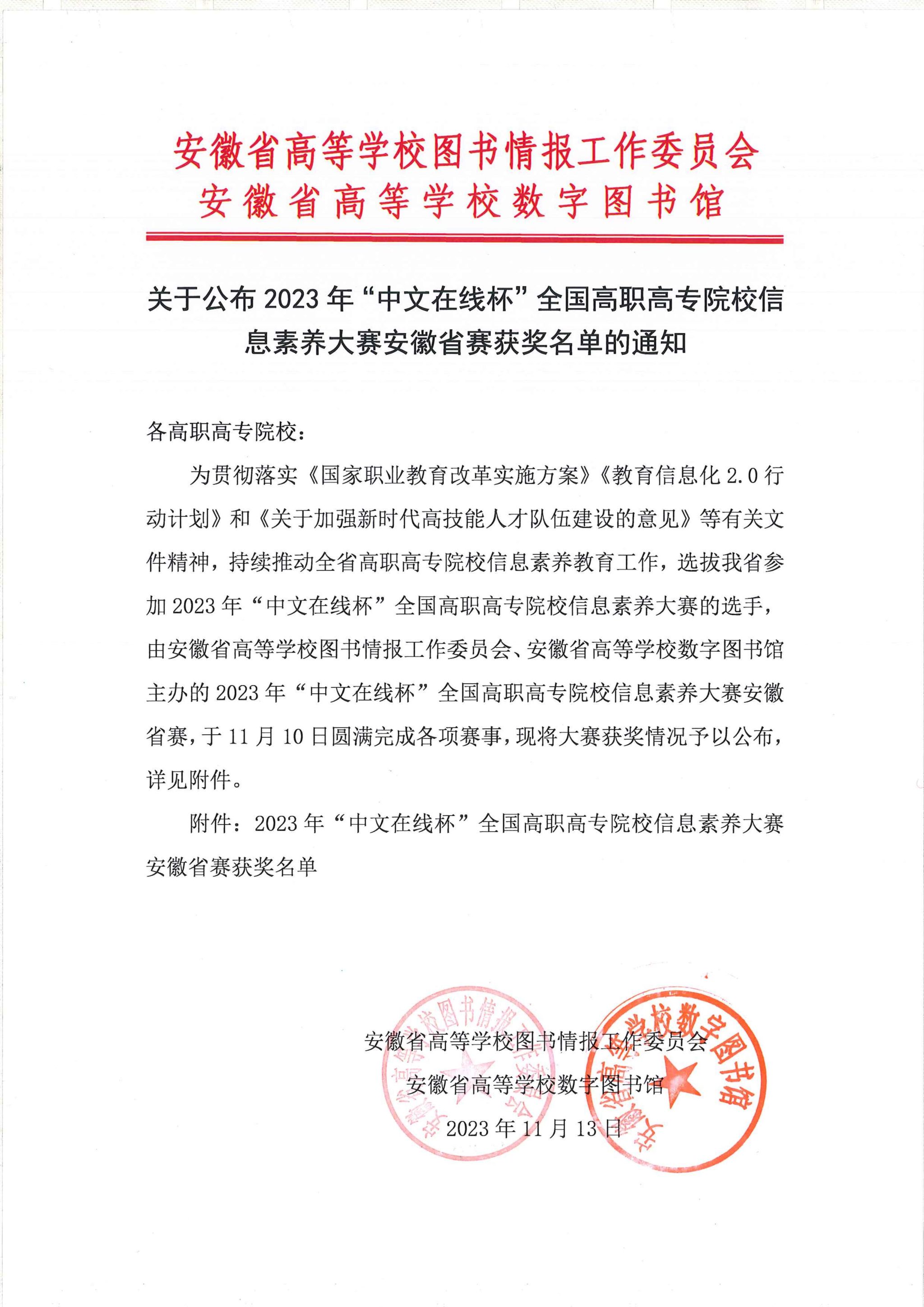 关于公布2023年“中文在线杯”全国高职高专院校信息素养大赛安徽省赛获奖名单的通知