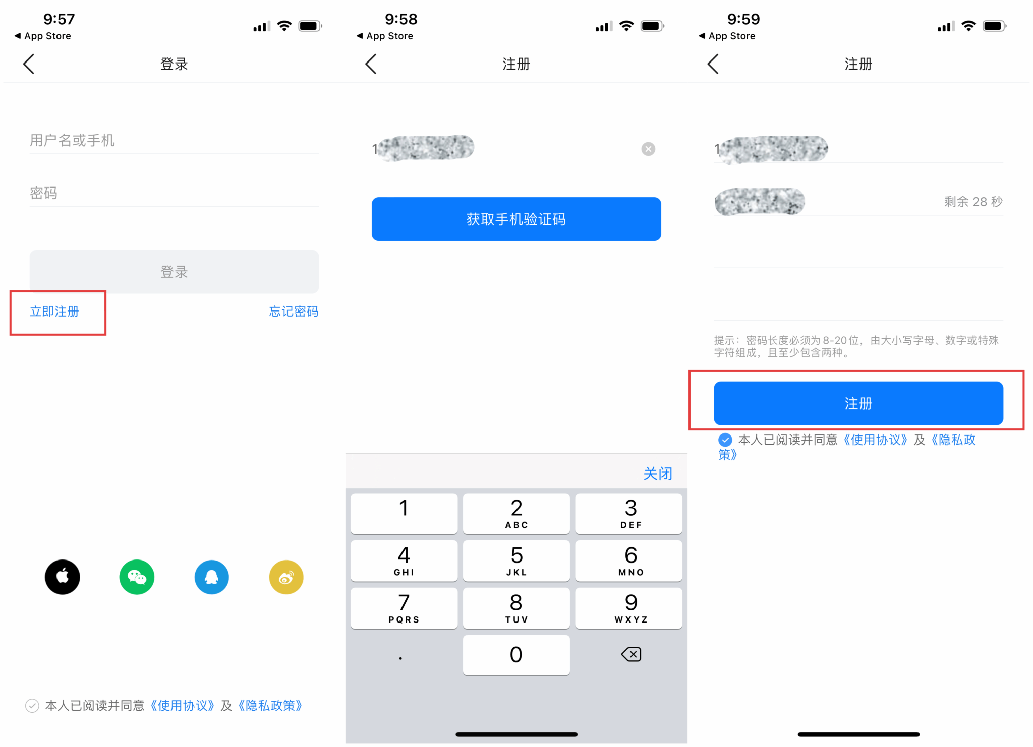 三、点击“立即注册”,输入个人手机号、验证码及自设密码进行注册;