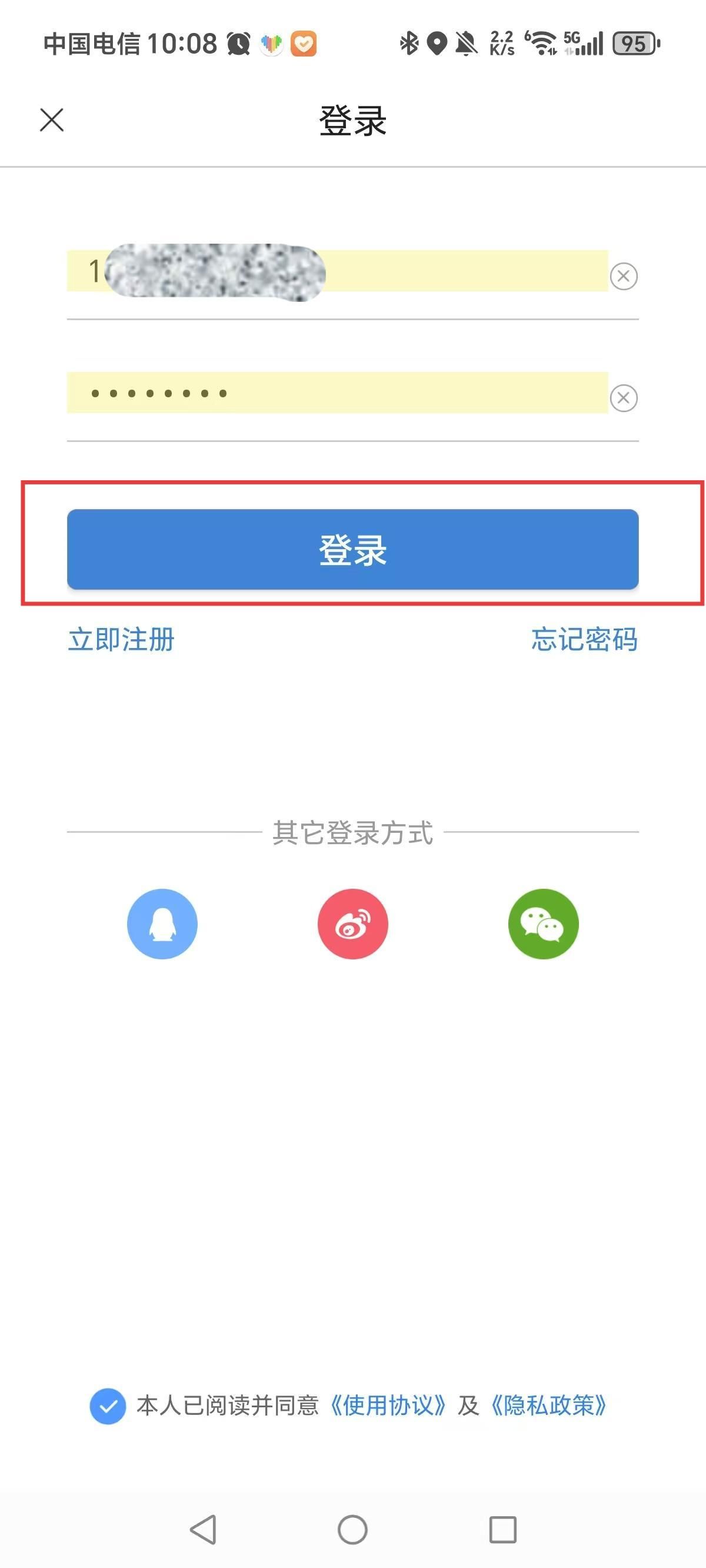 四、注册完成后,输入刚才注册的手机号和自设密码进行登录;