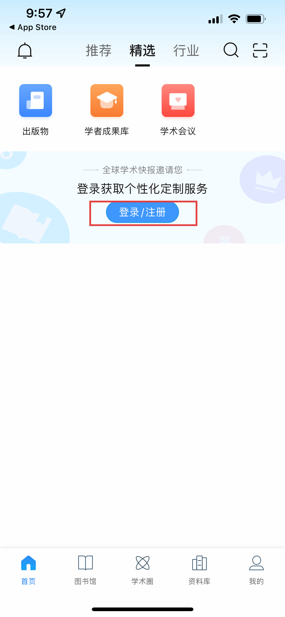 二、下载完成后,打开全球学术快报APP,点击首页“登录/注册”进行注册;
