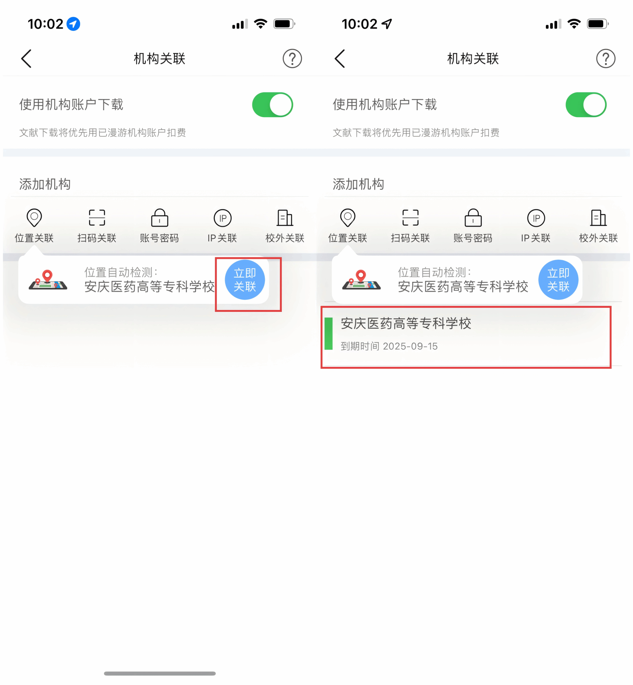 七、位置定位自动检测为“安庆医药高等专科学校”后,点击右侧“立即关联”,当下方显示“安庆医药高等专科学校 到期时间2025-09-15”后,则漫游服务设置成功。