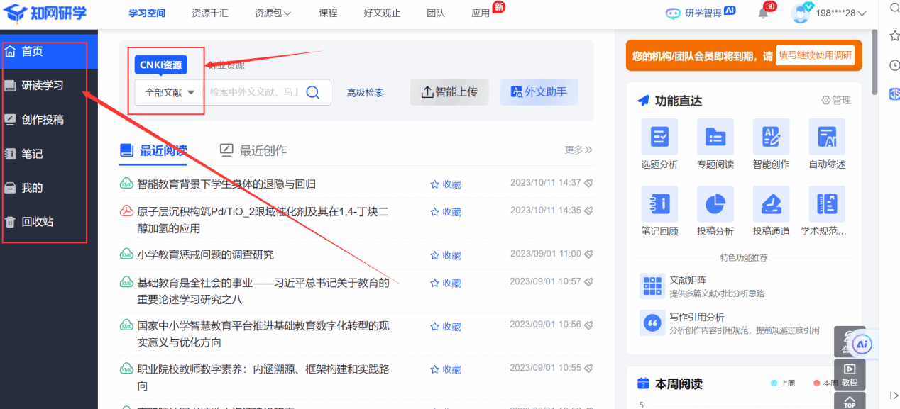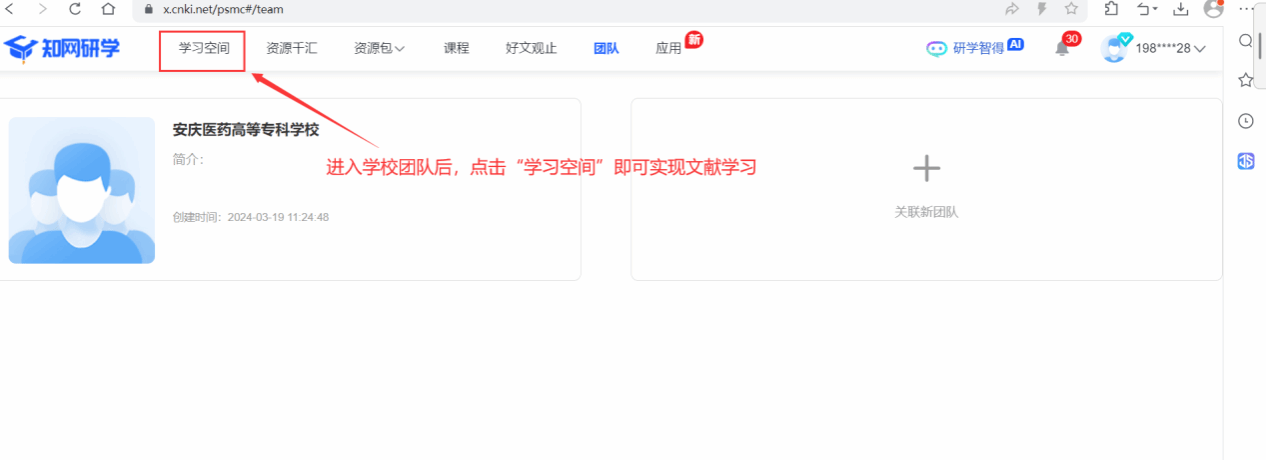 第二步:加入学校研学团队后,点击右上角的“学习空间”进入文献学习页面。