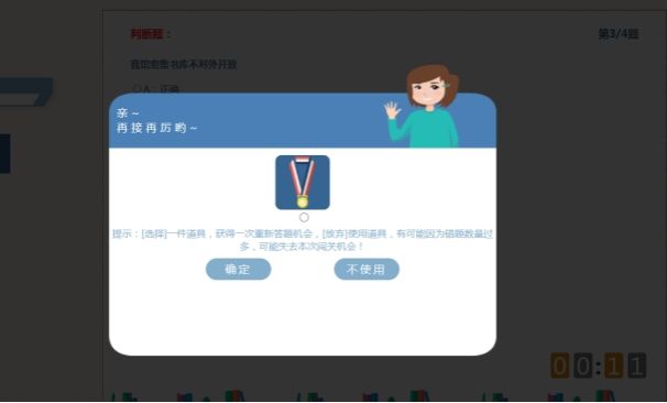 5. 请同学们认真读题并作答,答错题目时,可以使用道具来重获一次答题机会,一个关卡只能使用一次道具,答错两道题目时即为闯关失败,需要重新学习本关了,顺利过关后,就会获得新的道具,通往下一关。