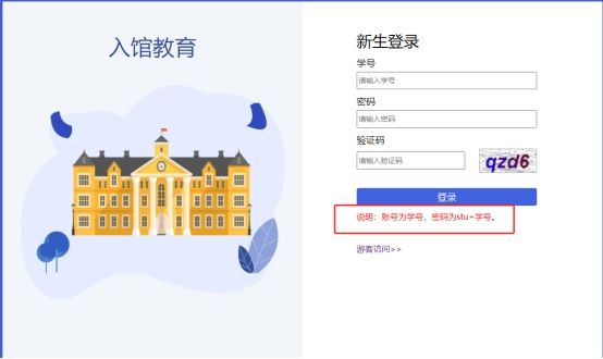 2. 点击”进入学习”后请仔细浏览游戏规则,然后“确定”,进入登录页面,2024级新生请输入账号密码登录(账号为学号,密码为stu+学号。)老生可以点“游客访问”。