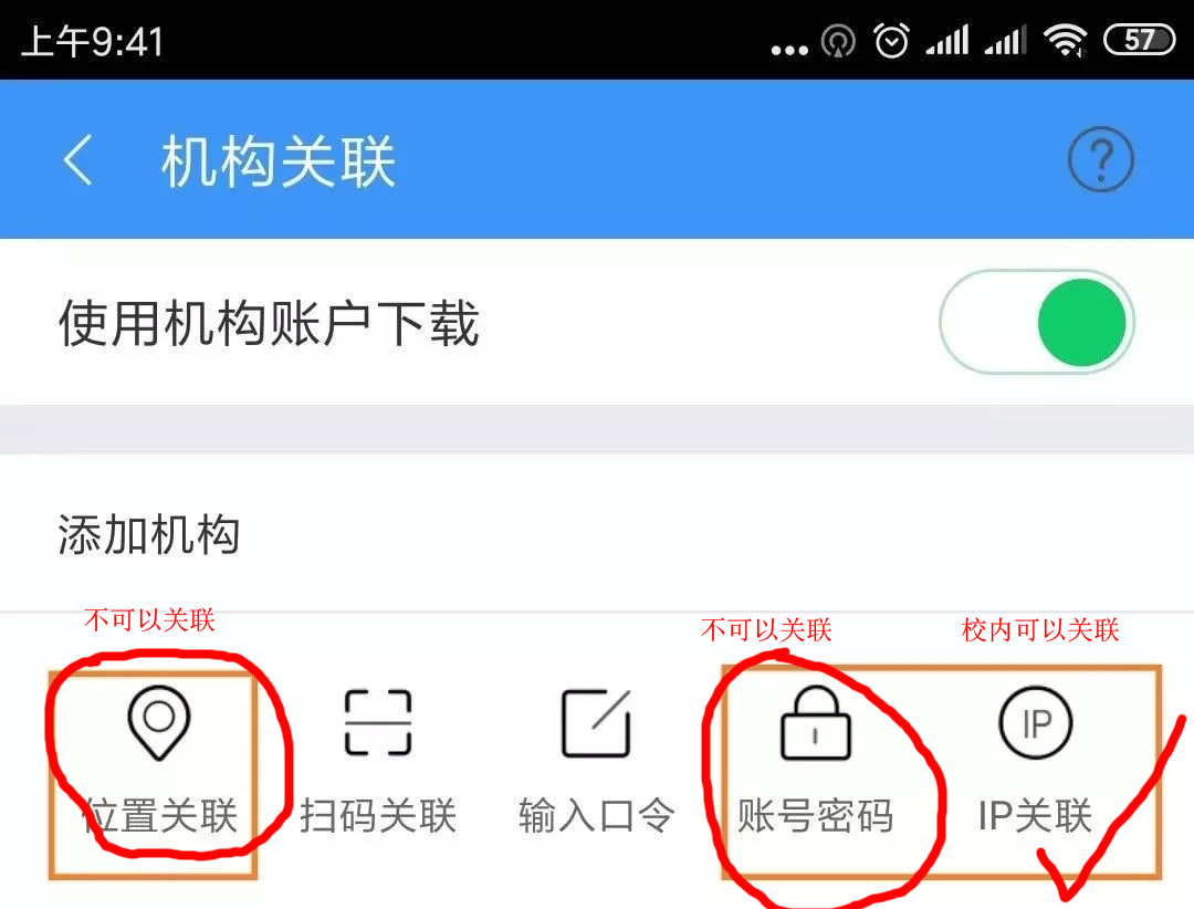 通过个人账号注册并登录成功后,与所在机构进行关联(手机连接校园无线网)。APP提供“位置关联”、“账号关联”、“IP关联”三种方式关联机构,目前我们学校可以在校内使用“IP关联”。