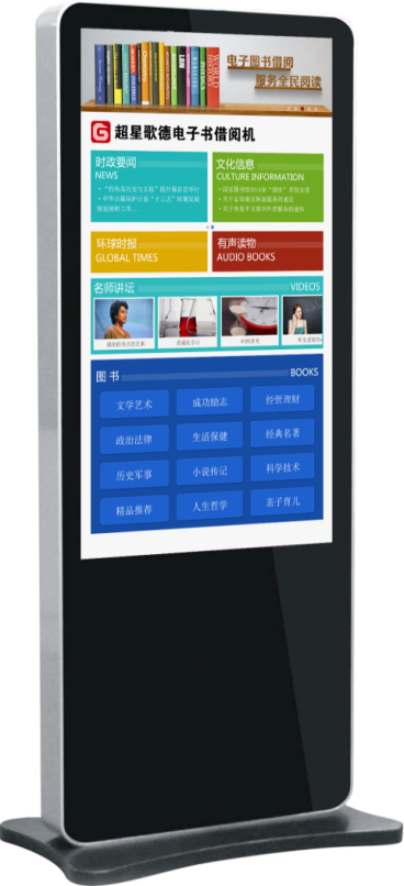 歌德电子书借阅机位于图书馆一楼入口处和二楼大厅,请读者自行用智能手机扫描机器屏幕上的电子图书二维码进行借阅。