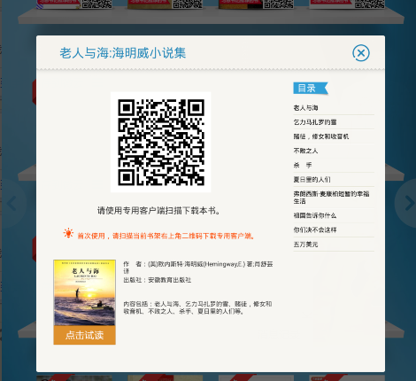点击打开感兴趣的图书分类,点击“精选推荐”(以“精选推荐”为例),进入书架;点击想要借阅的图书封面,进入图书详情页,可查看图书详情;点击封面下方“在线试读”,可直接试读该书;通过扫描封面二维码也可进行在线阅读。
