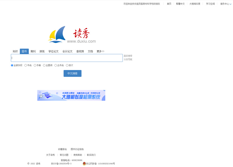 【数据库简介】“读秀知识库”是一个海量全文数据及元数据组成的超大型数据库,它能为读者提供260万种图书书目、170万种全文图书、6亿全文资料、5000万条期刊元数据、2000万条报纸元数据、100万个人物简介、1000万个词条解释等一系列海量学术资源检索及使用。同时,通过读秀学术搜索,还能一站式检索馆藏纸质图书、电子图书、期刊等各种异构资源,几乎囊括了图书馆的所有信息源。
