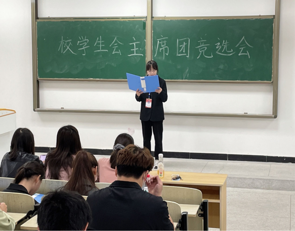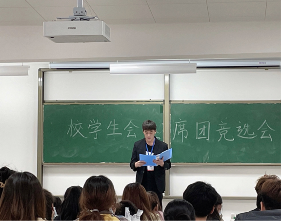 5月12日中午12:30,校学生会主席团竞选大会在第九阶梯教室召开,校团委、各团总支的相关指导老师担任评委,由各团学组织推荐的10名候选人依次上台,展示自我。
