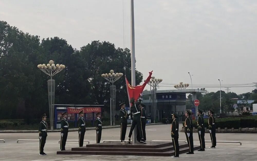 六点五十分,十二名国旗护卫队队员迈着铿锵有力的步伐,庄严的护卫国旗入场。伴随着《中华人民共和国国歌》 ,五星红旗冉冉升起,迎风飘扬。在场的每一个人向国旗行注目礼,深怀对祖国无限的热爱和崇高的敬意。
