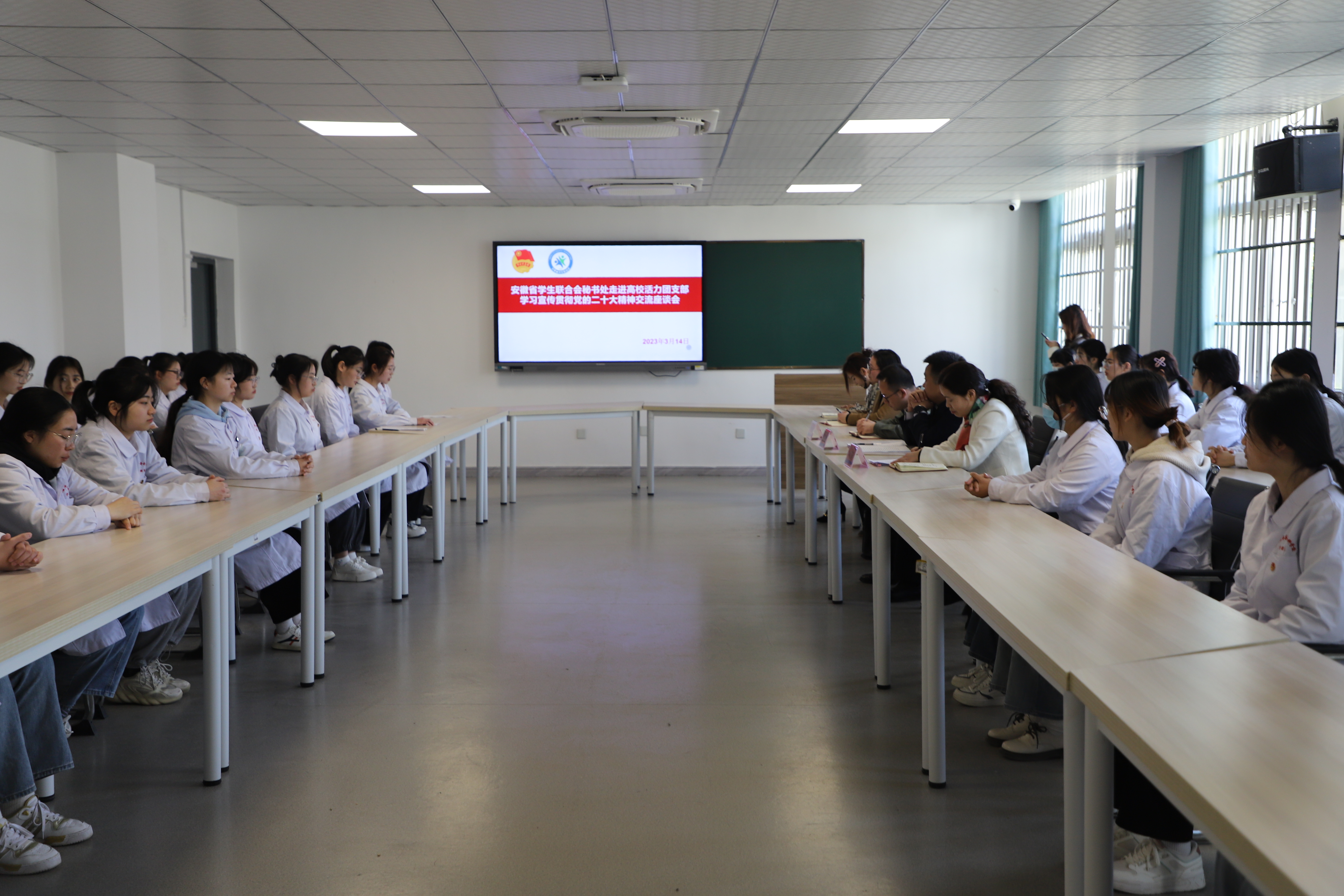 3月14日上午,团省委学校部副部长张国栋走进安徽省活力团支部——我校护理学院2021级护理14班团支部,向团员青年宣讲“党的二十大精神”,会议由团市委书记项薇主持,团市委副书记鲍瑜斌、校团委全体人员及班级辅导员参加。