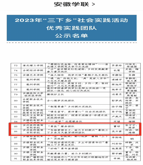 1.医学院“青医”三下乡社会实践团队秉承“青尽全力 ,医起奉献”的服务理念,联合医学专业教师、安庆市中医院内科、外科、妇科、康复科等特色科室医护人员,组成30余人师生团队,深入安庆市周边开展健康义诊、健康讲座、调研乡村振兴项目、感受当地历史人文,追寻红色足迹等系列活动,并成功入选全国大学生“乡村振兴”志愿服务队。