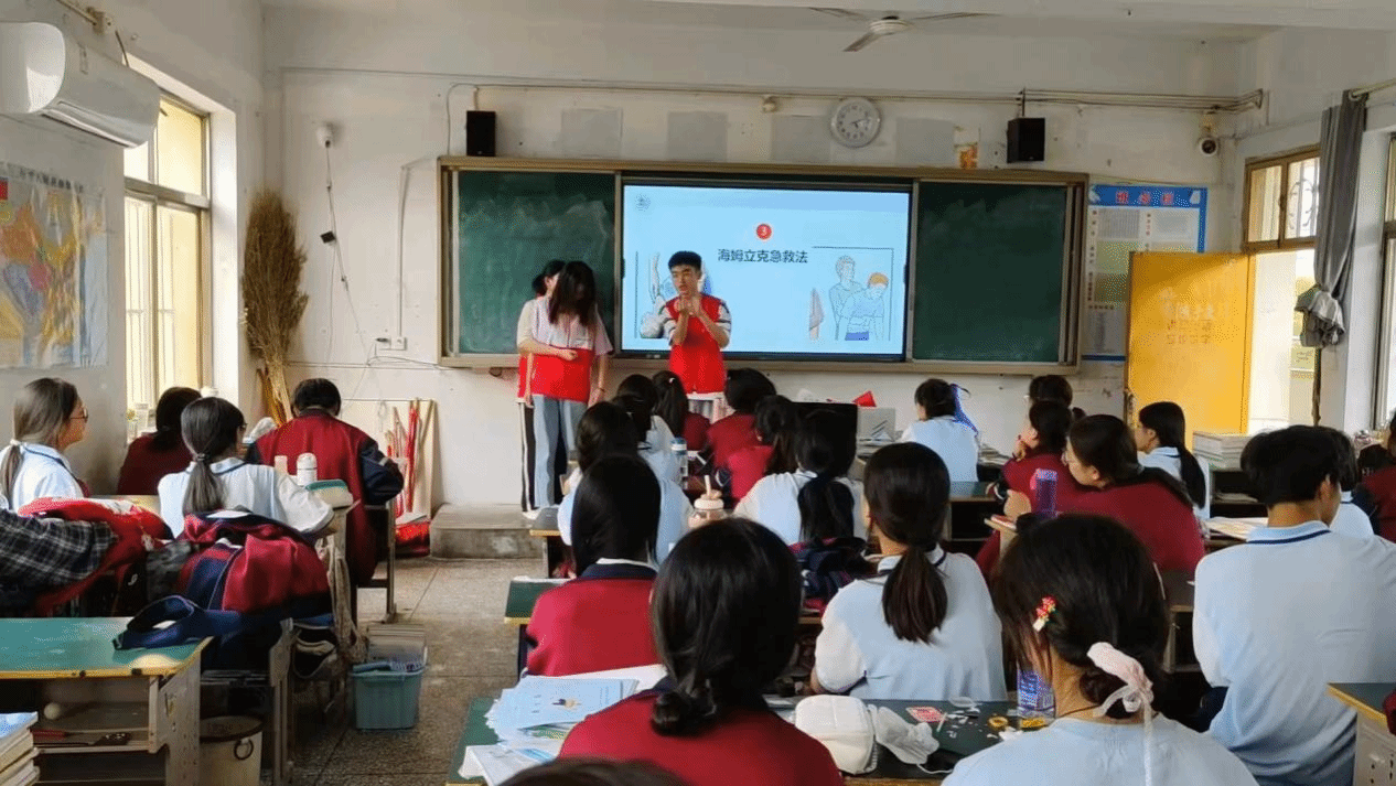 在宿州市砀山第四中学,志愿者们借助人体模型教具进行直观的急救技能操作展示,并与同学互动,耐心讲解心肺复苏和三角巾包扎动作的细节与要领,认真指导同学们进行实际操作,以便更好掌握心肺复苏的技能和各种包扎手法。