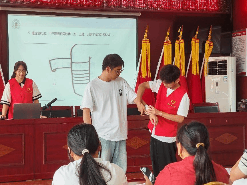 在六安市叶集区新元社区的活动现场,志愿者们通过图文并茂的讲解和现场演示,向居民介绍日常生活中常见意外伤害如擦伤、割伤、创伤等伤口的止血包扎技巧。