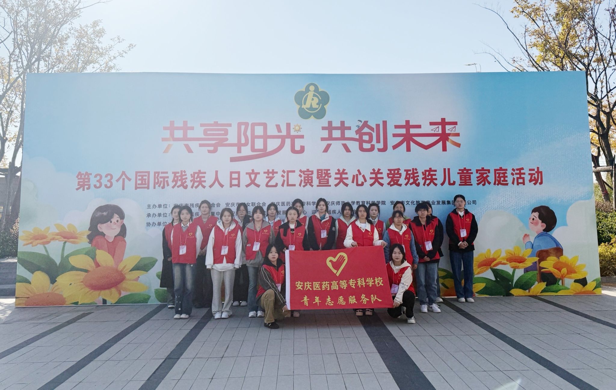 12月2日上午,为迎接第33个国际残疾人日的到来,安庆市残联联合市妇联、安庆医药高等专科学校、安庆师范大学教育科学学院、安庆市文化旅游产业发展集团有限公司共同举办了“共享阳光,共创未来”国际残疾人日文艺汇演暨关心关爱残疾儿童家庭活动。市人大常委会党组成员、副主任叶林霞,市政府副秘书长朱学云,市残联党组书记、理事长张驰,市妇联党组书记、主席金秋明,安庆师范大学教育科学学院党委书记何孔蛟,市文旅集团副总经理杨晶琦参加活动。我校选派20名青年志愿者全程参与活动的各项组织工作,用实际行动助力残疾人事业,展现青年担当。