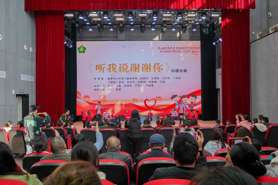 活动在欢快的乐器合奏中拉开帷幕,来自市残疾人康复中心的听障儿童和老师共同表演《听我说谢谢你》,小提琴演奏合着孩子们轻快的鼓点,配合默契,赢得观众阵阵掌声;此外,还有听障儿童带来的贯口表演《六尺巷》、歌舞表演《勇气大爆发》、沐阳之家残疾青年表演的律动鼓乐《小美满》等,精彩的演出展示了残疾儿童康复成果、更展现了他们积极阳光的心态和自强不息的精神风貌。活动中,爱心企业安庆市康明纳包装有限公司为参加演出的残疾儿童、青年等以及康复中心全体儿童捐赠了价值2万元的节日礼品。演出结束后,我校志愿者携手残疾儿童和青年共同打卡参观青少年宫、少儿图书馆。