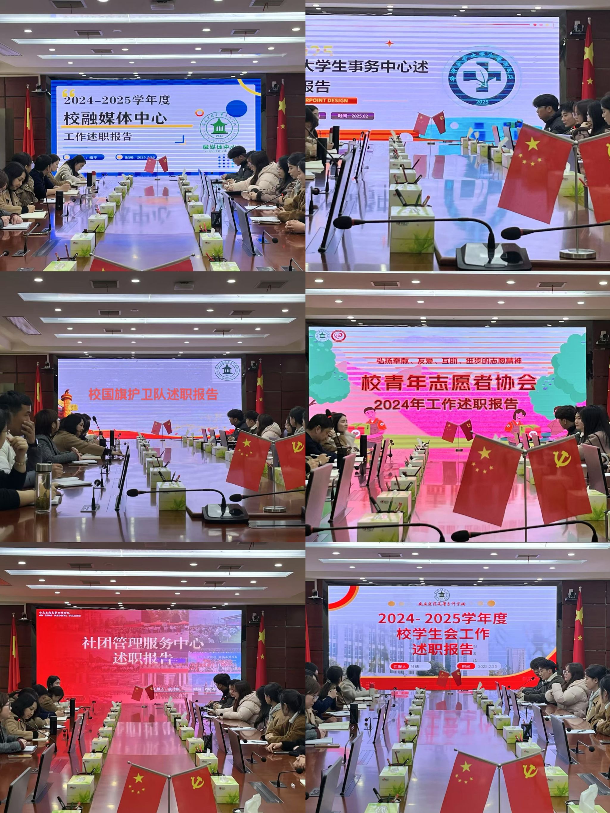校融媒体中心、国旗护卫队、大学生事务中心、青年志愿者协会、社团管理服务中心、校学生会6个校级学生组织负责人依次结合自身定位,从组织建设、工作开展、亮点成效、存在问题、改进措施及未来规划等方面进行年度述职,并结合工作实际对学校团学组织建设、校园文化建设等建言献策。