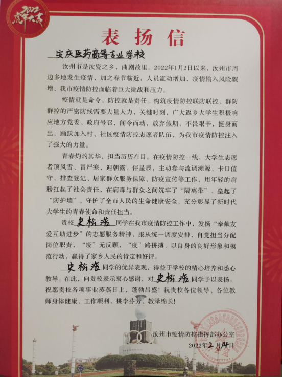 史松浩同学受到汝州市疫情防控指挥部表彰