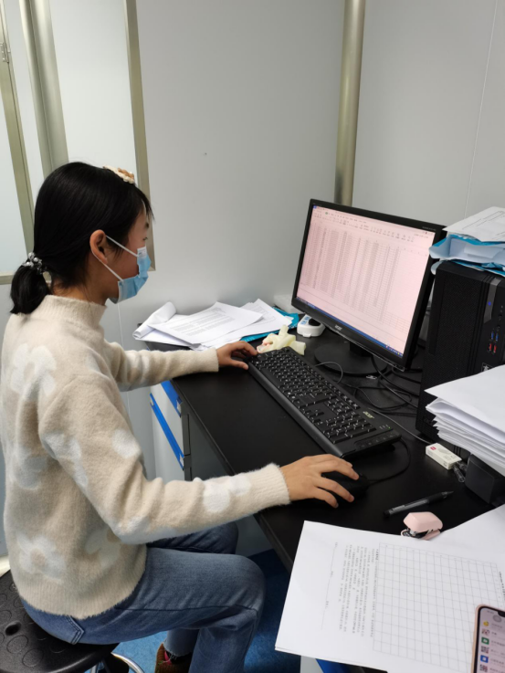 周美茹同学在驻马店市西平县疾控中心PCR室帮助医务人员统计与核对核酸结果