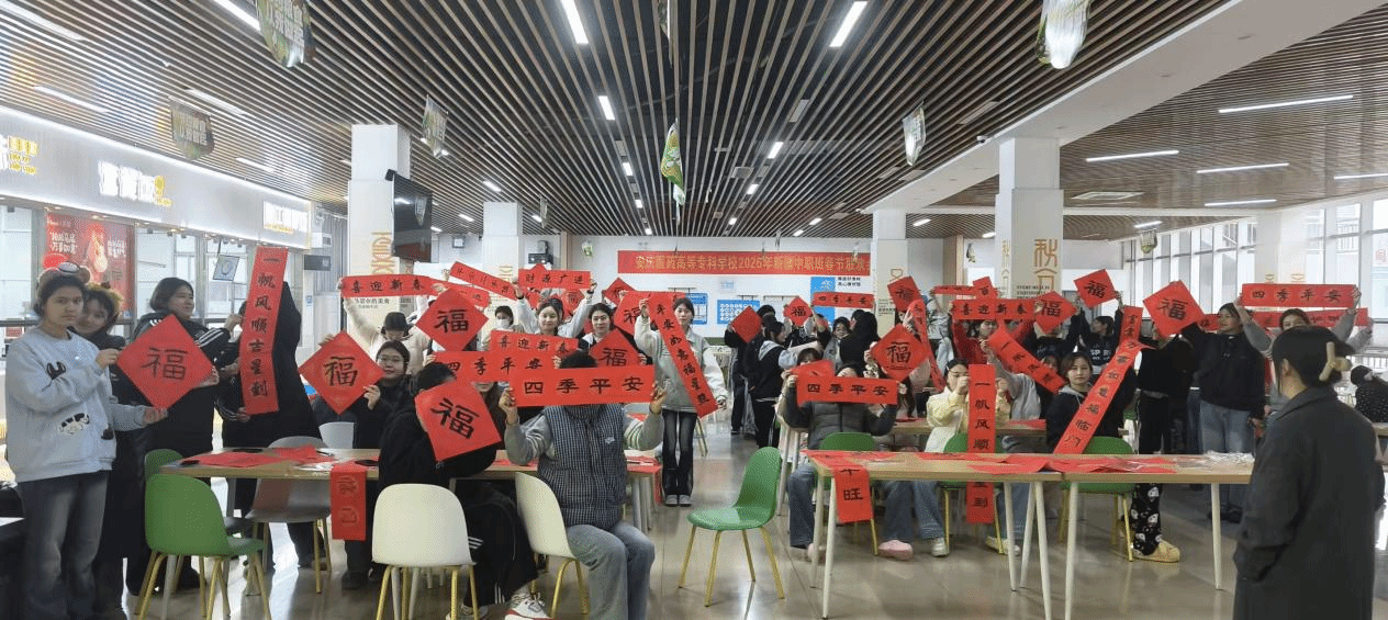 2月10日,我校学生食堂内张灯结彩,处处洋溢着浓厚的节日氛围,“石榴花开十六季·医…