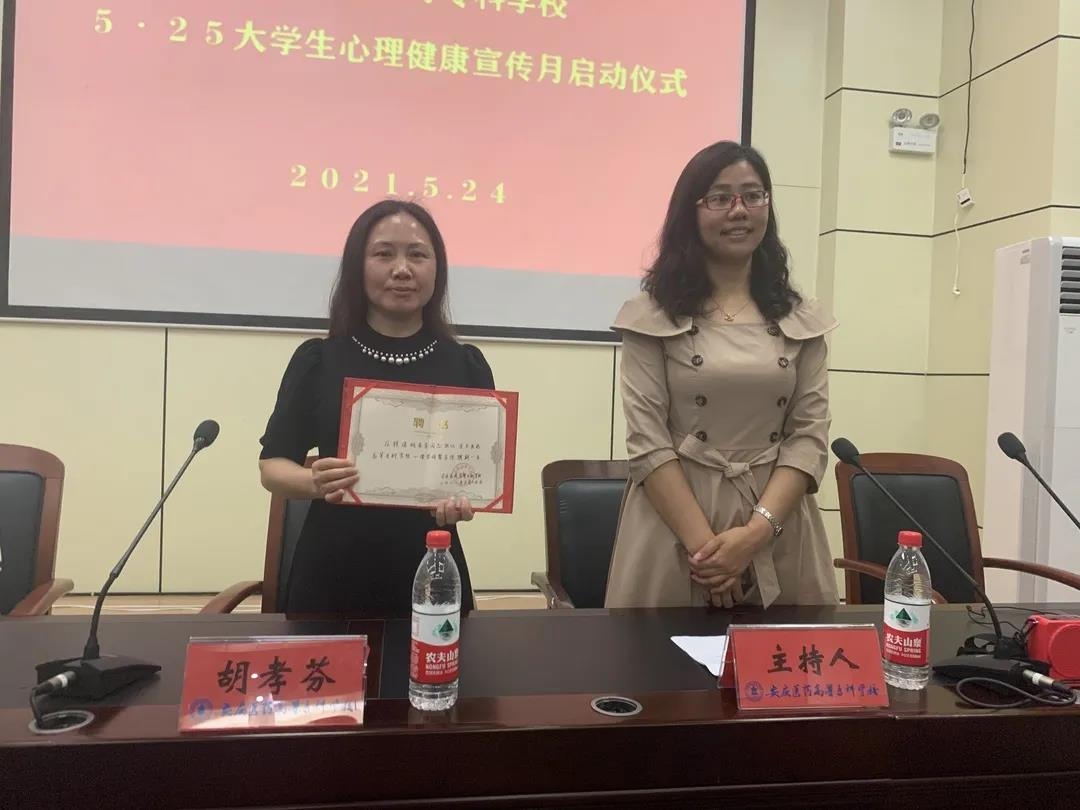 启动仪式由学生处负责人唐小丽主持并致辞,心理委员代表宣读了5·25心理健康宣传月倡议书,号召同学们要积极响应,踊跃参与各项活动。为进一步提升我校心理咨询工作的专业水平和咨询效果,学校还聘请了安庆市第六人民医院医学心理科主任胡孝芬为我校心理咨询督导师,并在启动仪式中颁发了聘书。