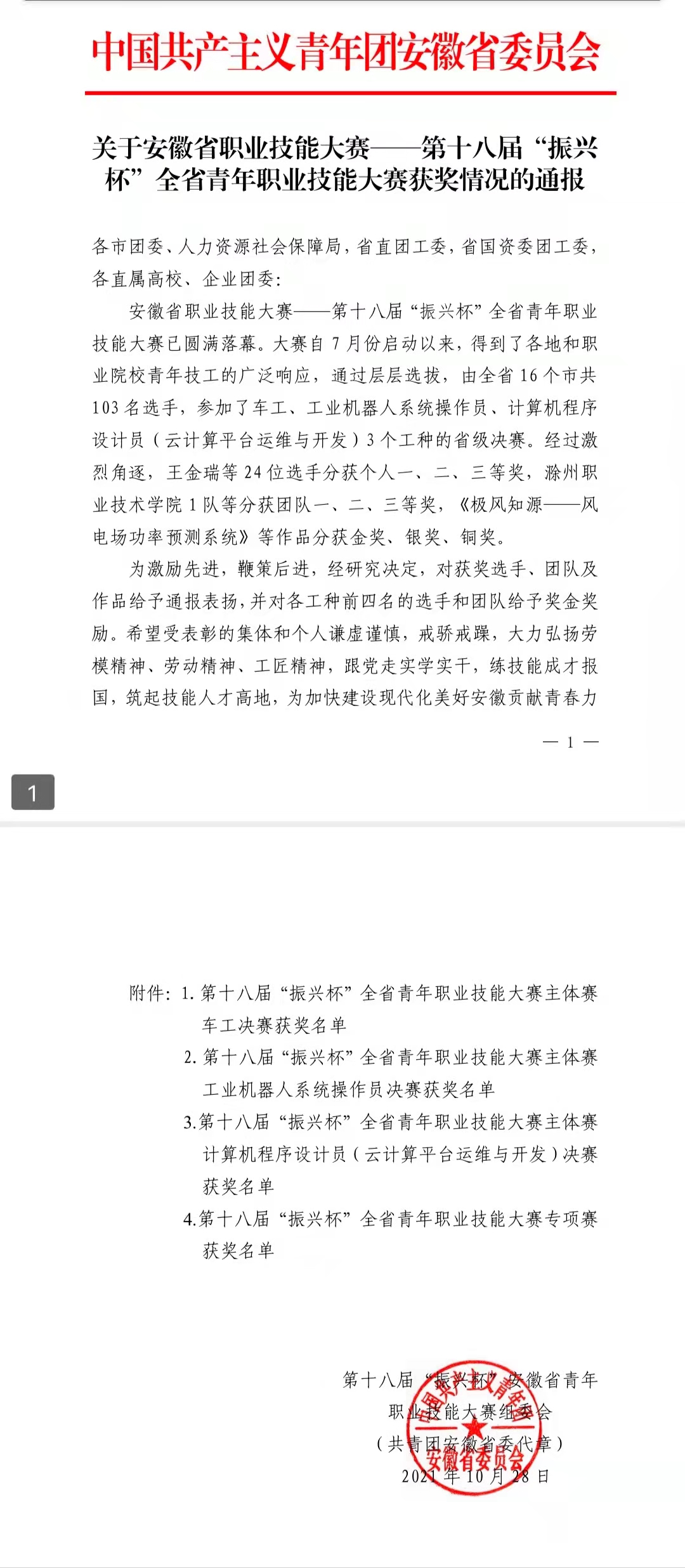 近日,由共青团安徽省委、安徽省人力资源社会保障厅联合主办的2021年第十八届“振兴杯”安徽省青年职业技能大赛结果公布,我校学生参赛团队报送的作品《皮康求APP-您身边的皮肤健康管理专家》获得专项赛(创新创效类)铜奖。