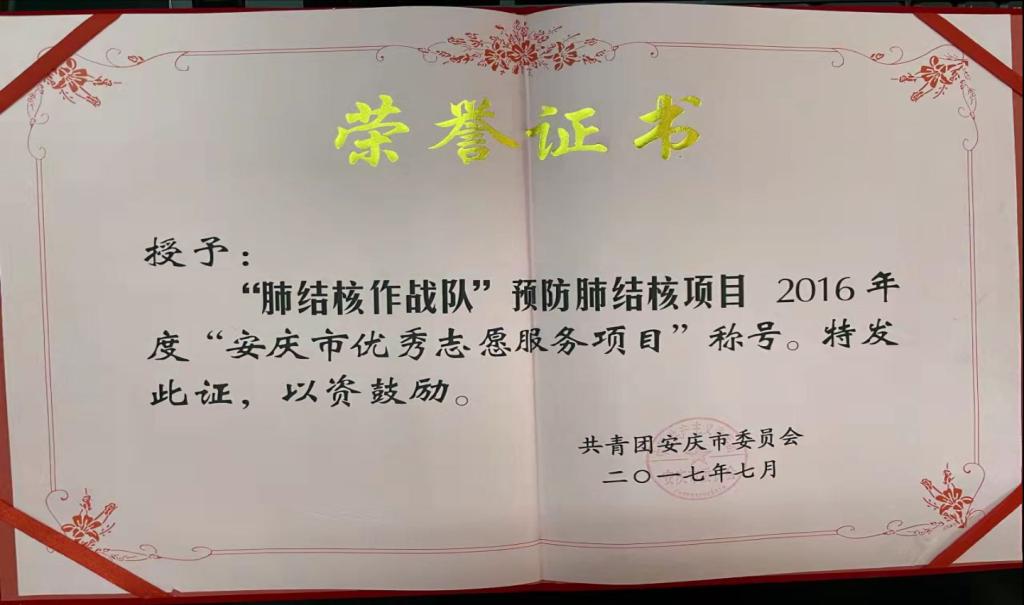 我校青年志愿者服务中心(原名校青年志愿者协会)“肺结核作战队”自2016年开始参加肺结核防治宣传志愿者活动项目,并在同年成功申报“安徽省百千万志愿者肺结核知识传播行动”大学生志愿团体培育计划二等资助,同时“肺结核作战队”预防肺结核项目获得“安庆市优秀志愿者服务项目”称号。