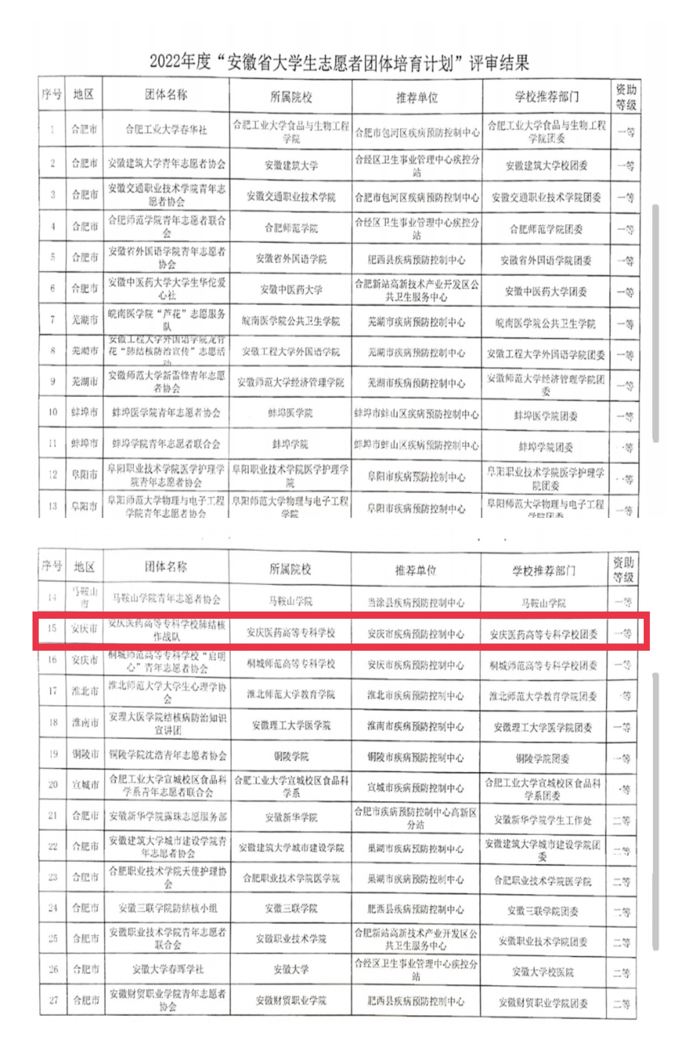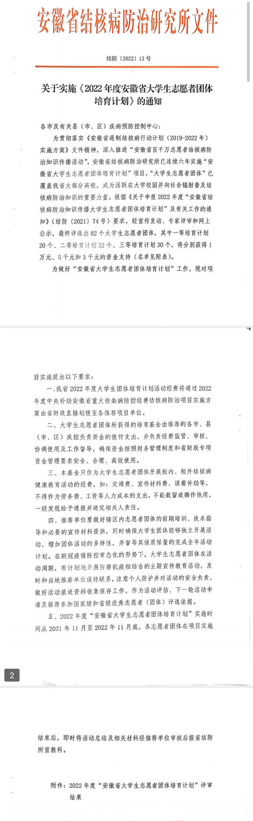 我校青年志愿者服务中心“肺结核作战队”成功申报2022年度“安徽省百千万志愿者结核病防治知识传播活动大学生志愿者团体培育计划”,从全省入围的82个团体中脱颖而出,获得一等资助。