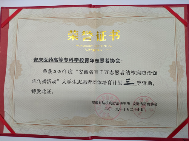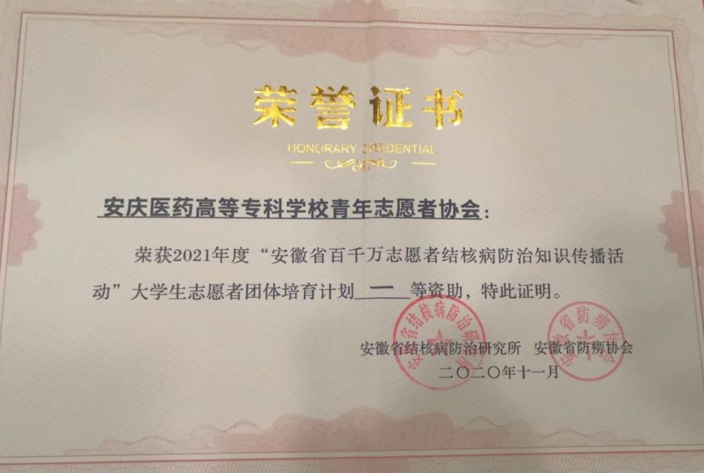 我校在2021年安庆市大志愿者团体结核病防治知识竞赛荣获一等奖,2019年、2020年、2021年,连续三年获得“安徽省百千万志愿者结核病防治知识传播活动”大学生志愿者团体培育计划资助,其中2019年是三等资助,2020年和2021年是一等资助。