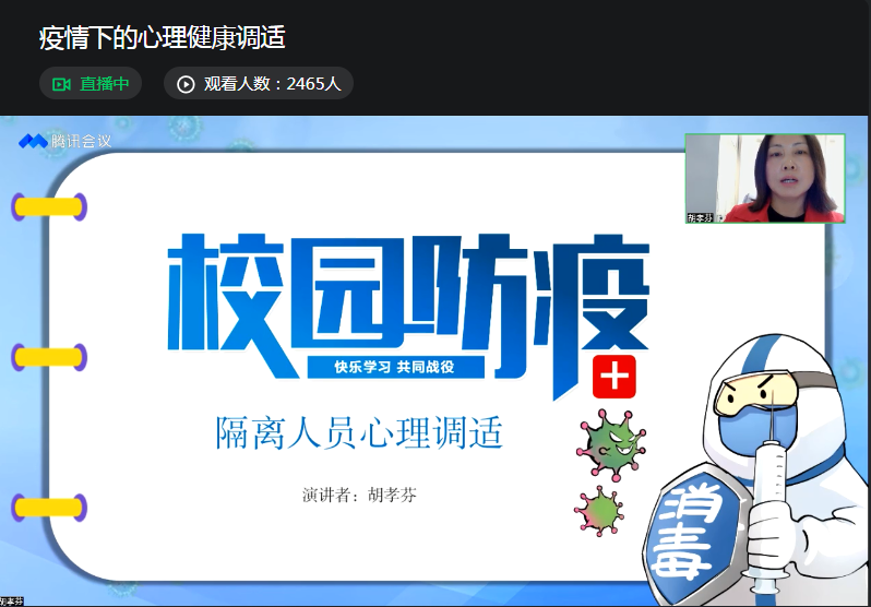 本次讲座中,胡孝芬主任分享了新冠疫情中人们常见的心理困惑及积极心理学的解决办法,围绕五个模块展开。首先要学会如何识别、面对和接纳负性情绪;在疫情封闭期间,要理性获取权威疫情资讯,信任和关注官方平台发布的信息;要保持作息规律、饮食均衡;要适应自己“被隔离者”新的身份;最后要掌握一些自我调适技术,做好个人规划以及如何运用积极心理学策略取得抗疫的成功。