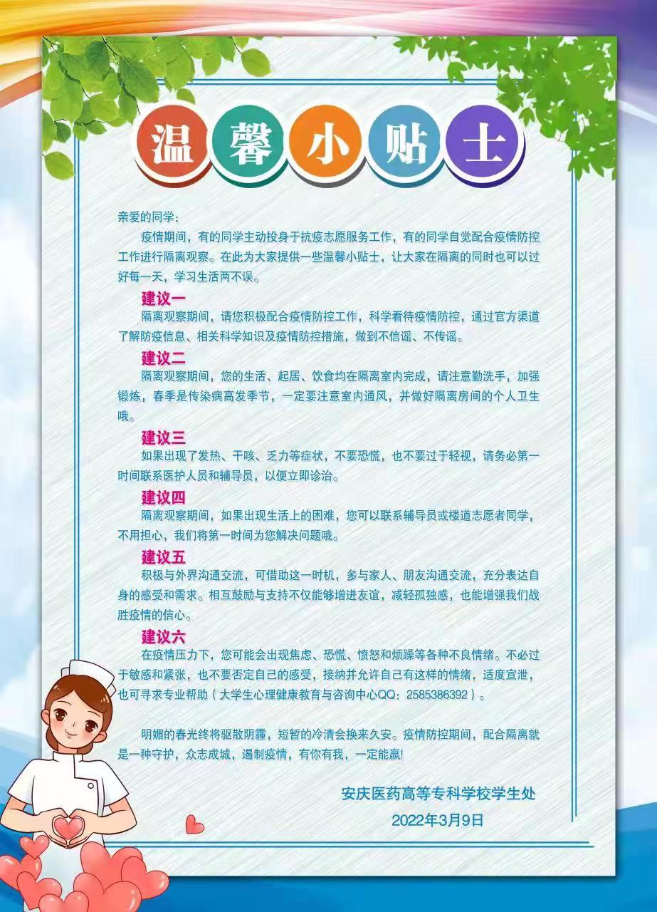 疫情防控期间,校大学生心理健康咨询与服务中心第一时间开通了线上心理咨询,面向全校师生持续开展常规和疫情的线上心理咨询工作,制作温馨提示卡并利用微信公众号开展知识宣教;学校第一时间成立心理辅导专班,安排专业心理老师对所有校外隔离学生进行了一对一的线上心理疏导,了解学生心理情况,及时解决学生困难,稳定学生情绪;对于校内隔离同学,安排辅导员及时保持和同学的沟通,了解学生的情况和需求,安排好学生做好各项服务,做好心理疏导,对有心理咨询需求的由学院及时报心理咨询中心统筹安排;用“心”抗疫,不断加强心理健康教育工作的实时性和有效性。