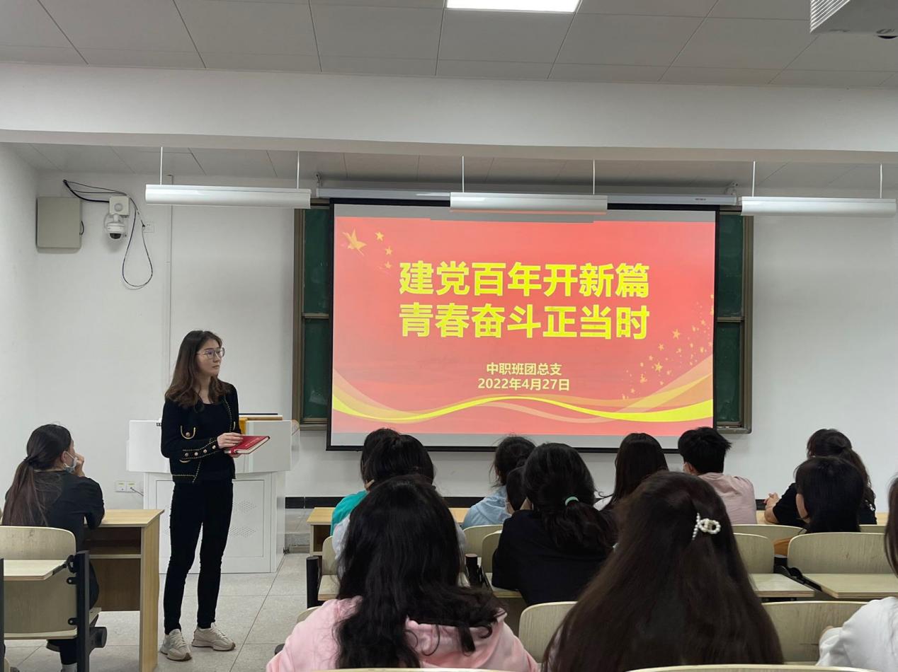 中职班团总支书记、辅导员毛丽丹老师作近期团委工作总结,对中职班各团支部的工作进行表扬,通报了优秀团支部、优秀团干部、优秀团员的获奖同学,以“建党百年开新篇,青春奋斗正当时”为主题进行了党史教育学习,要求同学们积极向团组织靠拢,刻苦学习本领,发挥聪明才智,始终保持拼搏向上、奋斗进取的精神,始终走在时代最前列,担负起国家发展进步的历史责任。