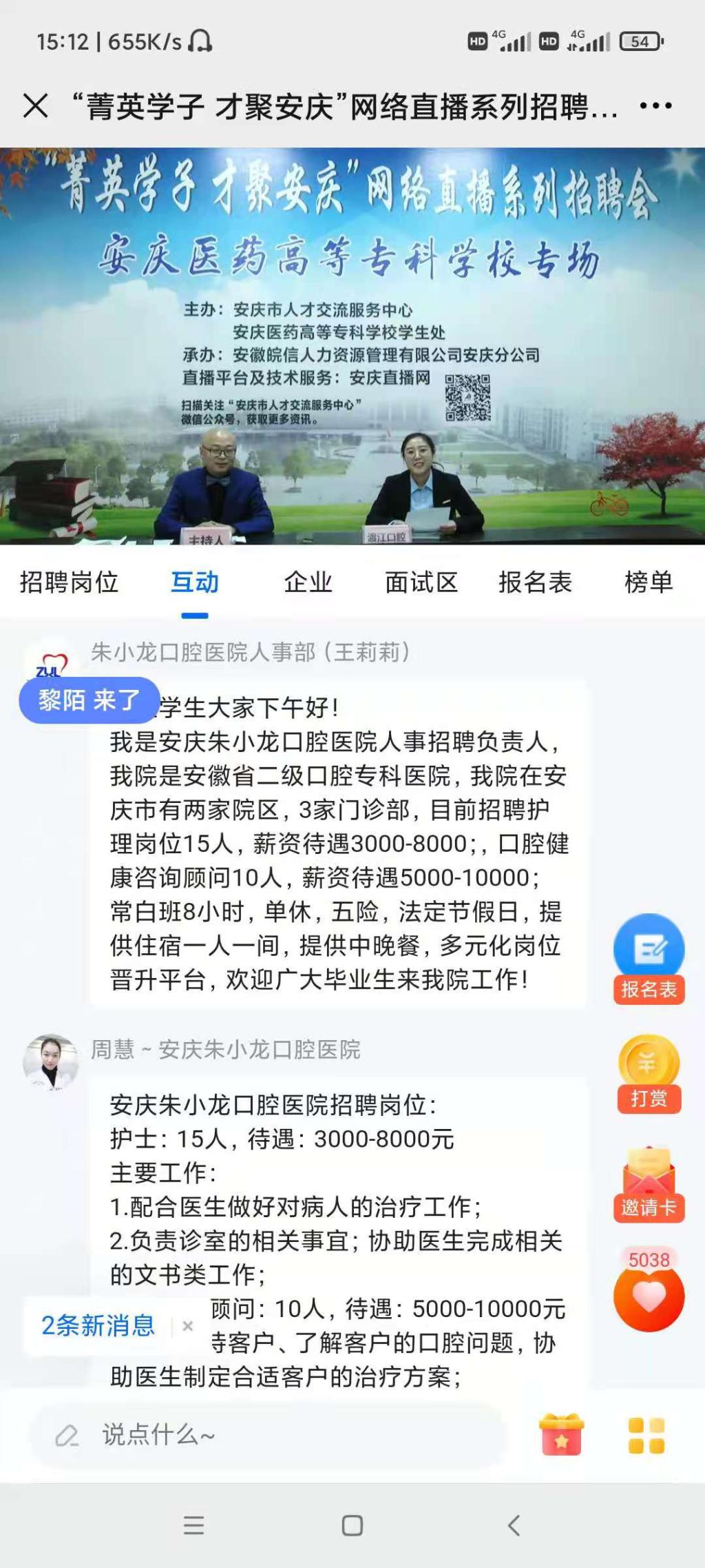 为深入贯彻落实党中央国务院和省委省政府稳就业保就业决策要求,我校紧紧围绕省委“一改两为”大会精神和市委市政府“双招双引”重大决策部署,着力为民办实事,全力促进高校毕业生更加充分更高质量就业,助力青年人才留宜兴宜,5月14日我校与安庆市人才交流服务中心联合举办“菁英学子才聚安庆”校党委书记访企拓岗促就业暨“直播带岗”专场招聘会。校党委书记叶林霞、党委委员陈琪等出席招聘会,安庆市人社局副局长方敏及安庆市立医院、朱小龙口腔医院、安庆市博爱医院、上海宝龙安庆药业有限公司等13家本地企业共同参加了线上访企拓岗促就业招聘会。
