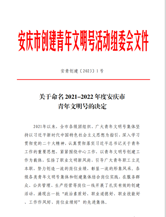 近日,安庆市创建青年文明号活动组委会下发《关于命名2021-2022年度安庆市青年文明号的决定》(安青创建〔2023〕1号)文件,为表彰先进,树立典型,进一步推动全市青年文明号活动的深入展开,经安庆市创建“青年文明号”活动组委会决定,命名在2021-2022年度安庆市青年文明号创建周期中,符合创建条件且表现突出的安徽海盾建材有限公司技术部等62个创建集体为"2021-2022年度安庆市青年文明号"。