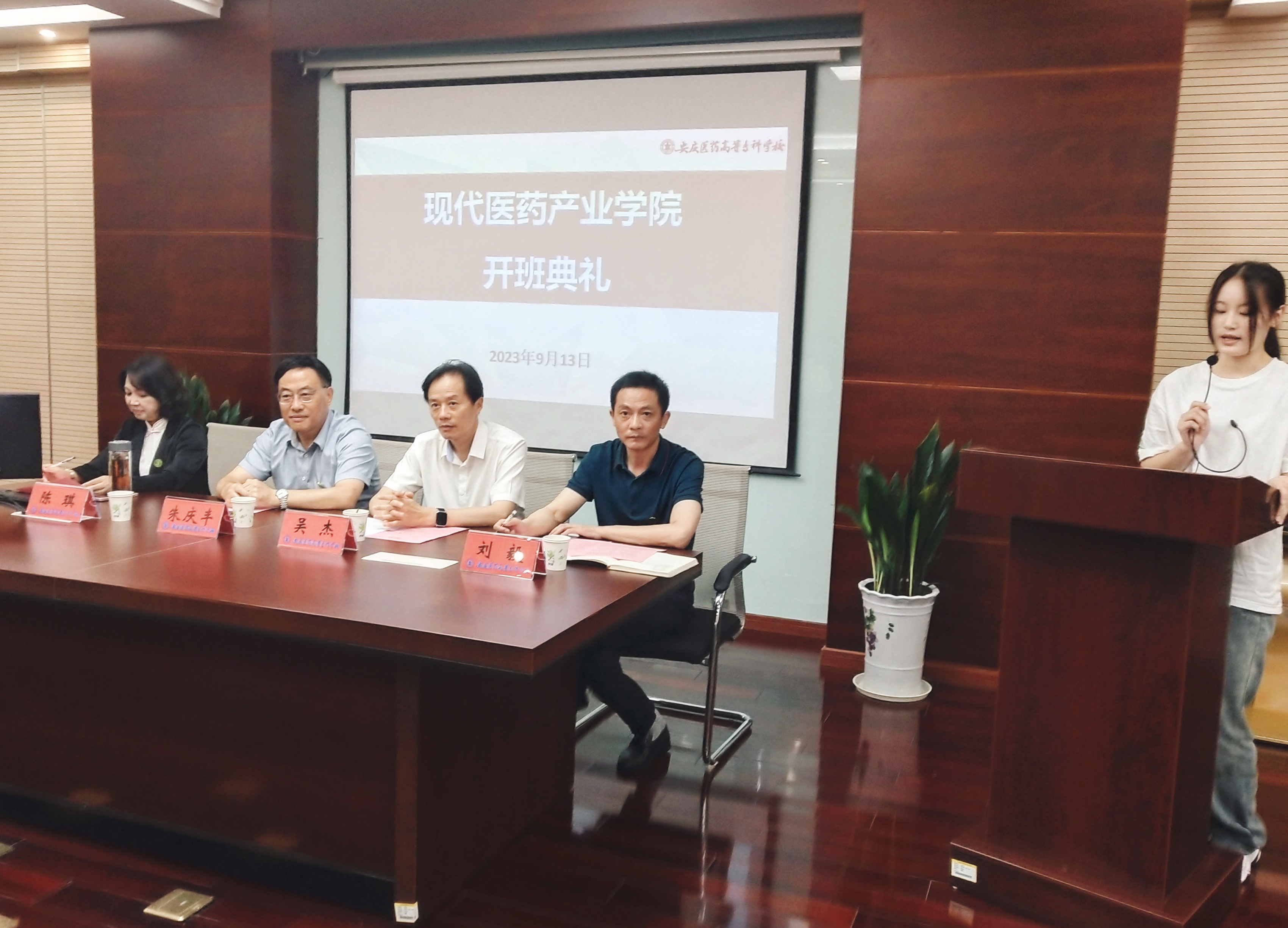 2023年9月13日下午,现代医药产业学院2022级开班典礼隆重举行。现代医药产业学院院长、长三角药物高等研究院(简称“长高院”)党支部书记吴杰,党委委员、副校长朱庆丰,党委委员陈琪,党委委员、药学院党总支书记、院长刘毅及相关处室负责人出席了本次开班典礼。