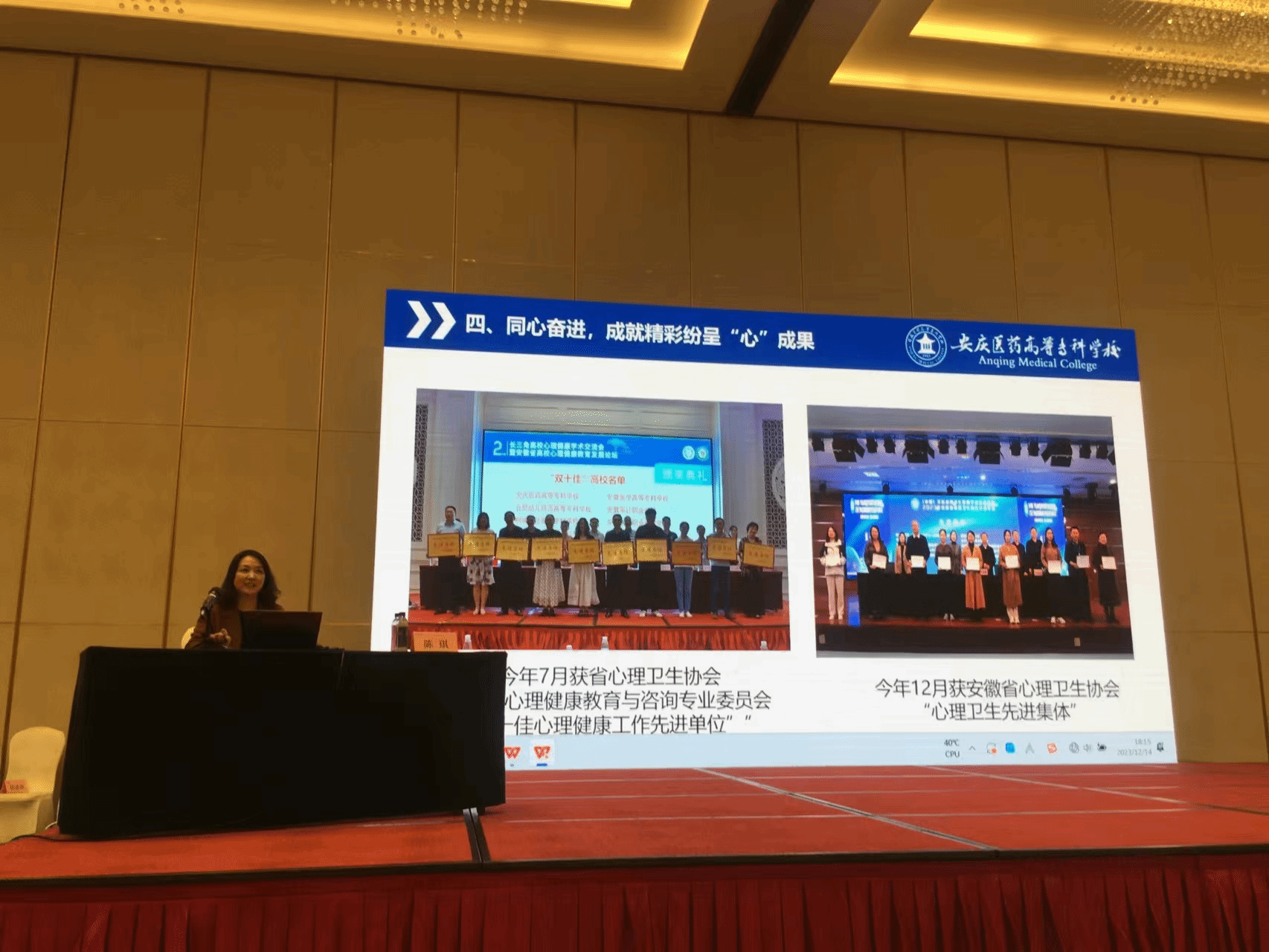 本次培训班邀请中国科学技术大学,芜湖市教育局以及我校作经验交流。我校党委委员陈琪代表学校以“全员育心多元赋能成长,全心育人激扬蓬勃人生”为题,从同心发力,健全联动育人“心”队伍;同心引领,打造多元教育“心”体系;同心实践,落实生命安全“心”保障;同心奋进,成就精彩纷呈“心”成果等四个方面分享交流。学校一直以来坚持以立德树人为根本任务,坚持“以生为本、预防为基、教育为先”的工作理念,坚持“全面教育与重点预防”相结合的工作方针,坚持“用情用心用力,做实做细做精”的工作作风,以提高学生心理素质和培养学生健全人格为目标,全面开展学生心理健康教育各项工作。目前已形成以心理健康课程为中心,心理提升计划为主线,心理咨询工作为重点,医校联合服务为平台,班级心理委员为纽带,心理拓展活动为特色的工作新格局,进一步守护大学生心理健康。(撰稿、供图:杜慧凤;审核:唐小丽)